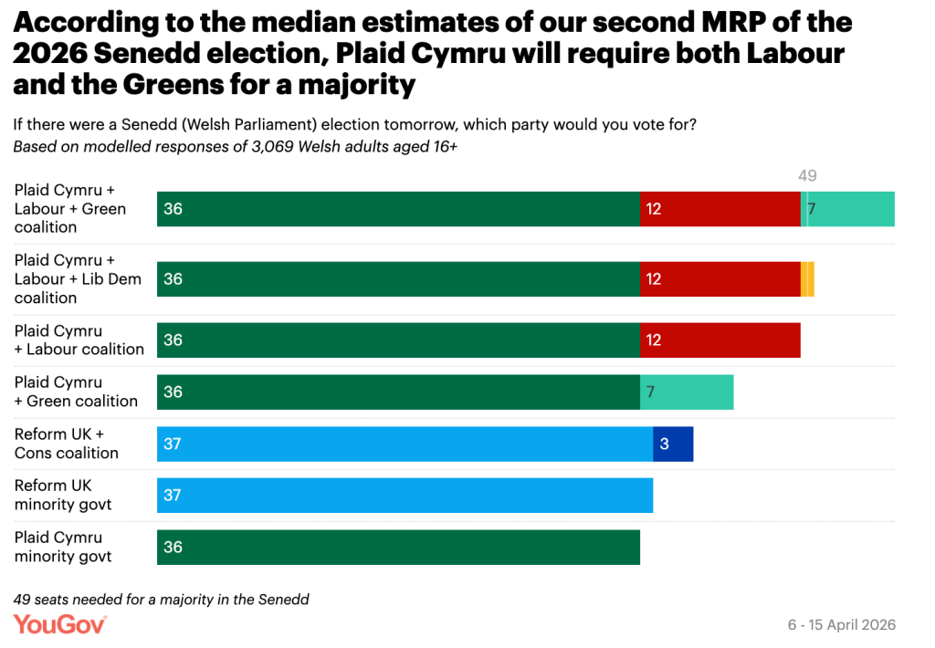 According to YouGov’s second MRP, Plaid Cymru will require both Labour and the Greens for a majority(Image: YouGov / ITV Cymru Wales, 6–15 April 2026)