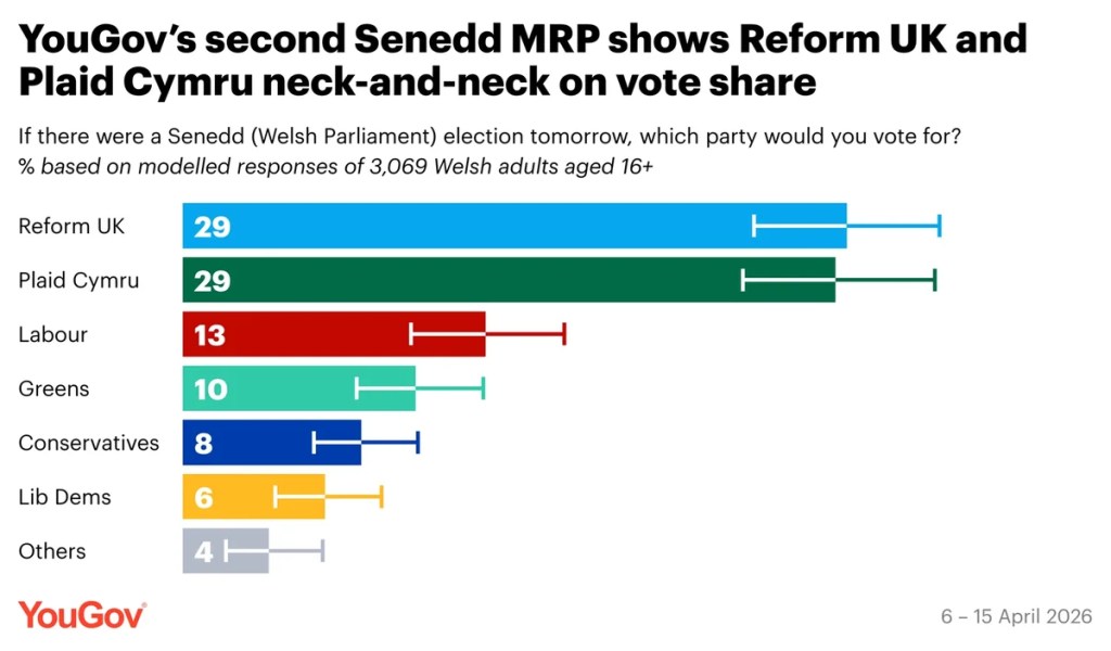 The most detailed of the two is YouGov’s second MRP for ITV Cymru Wales, produced in partnership with Cardiff University’s Wales Governance Centre on a sample of 2,387 Welsh adults between April 6 and 15. It projects Reform UK on 37 seats and Plaid Cymru on 36 — a significant tightening since YouGov’s first MRP last month, when Plaid led by a wider margin. Both parties are tied on 29% of the vote in the latest YouGov model, with Labour on 13%, the Greens on 10%, Conservatives on 8%, and the Liberal Democrats on 6%.