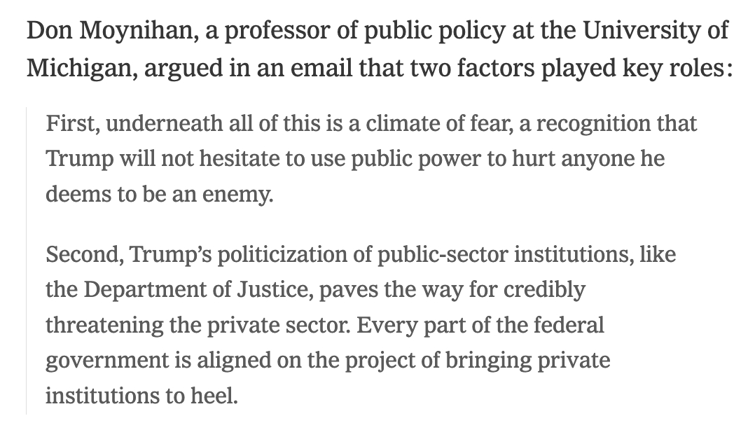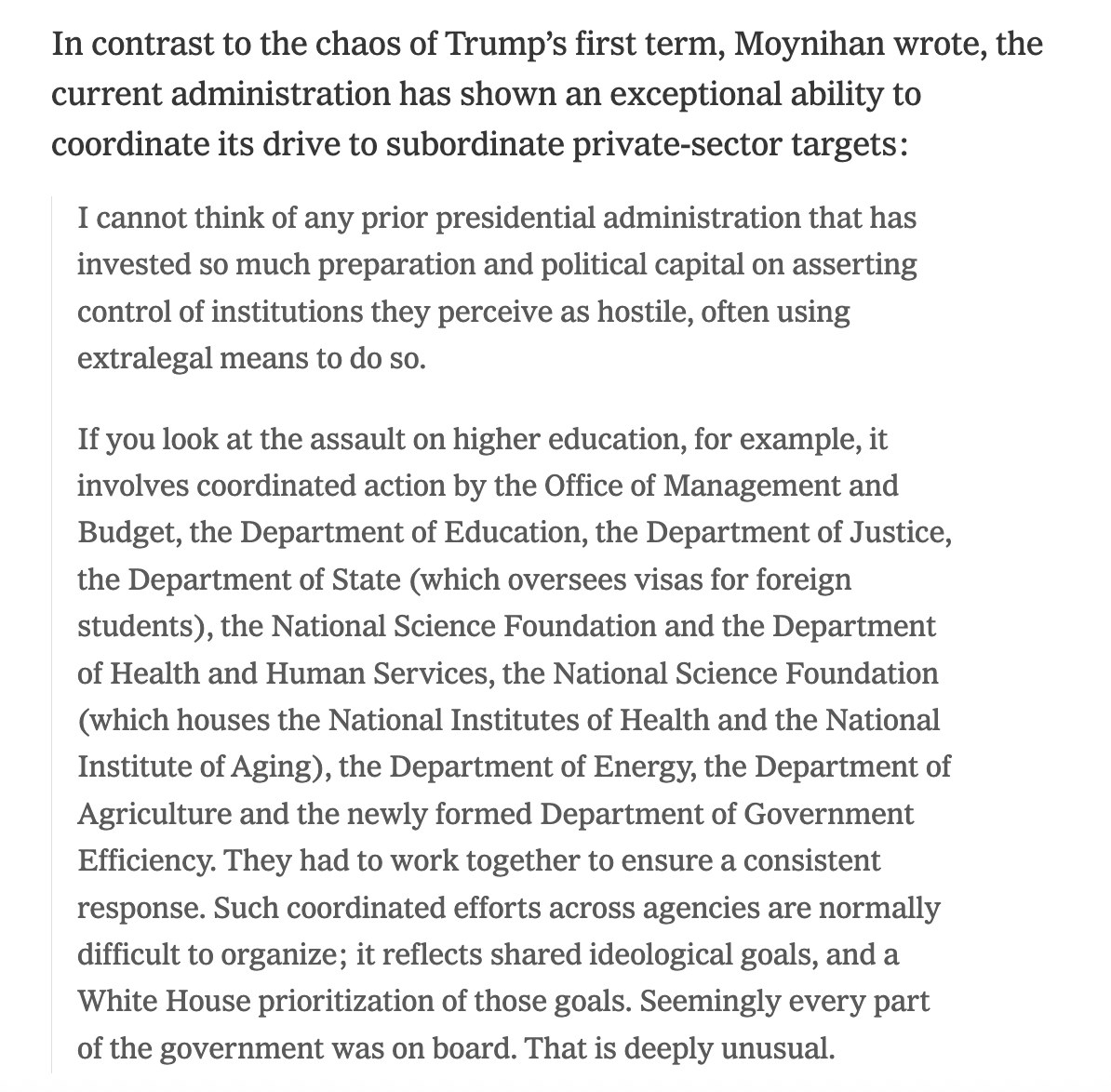 In contrast to the chaos of Trump’s first term, Moynihan wrote, the current administration has shown an exceptional ability to coordinate its drive to subordinate private-sector targets: