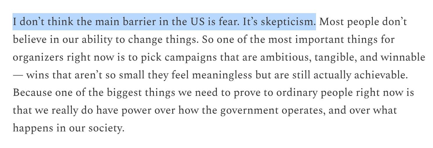 I learned a lot from this interview with Aru Shiney-Ajay—executive director of the Sunrise Movement, and a Minneapolis resident-organizer—and I’m still thinking about this point on skepticism, not fear, being the main barrier to activating people in the US.