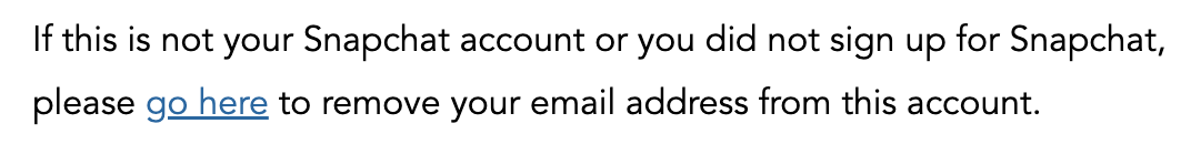 So I got yet another automated email from someone who signed up for a thing with one of my email addresses, thinking it's their email address. Props to Snapchat for being the first and only company I've seen that provides a one-click way to fix this situation.