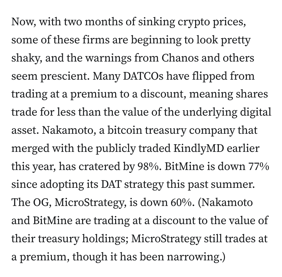 This is a scary trend, particularly for traders holding shares in firms that have relied on debt to accumulate their crypto hoards. If crypto prices fail to rally before that debt comes due, the firms could be forced to sell their crypto. Large forced sales, or forced sales across many DATCOs, can depress prices further, only exacerbating the problem. Researchers with Galaxy Digital have compared the potential “unwind” to the busting of the 1920s investment trust boom, writing:12