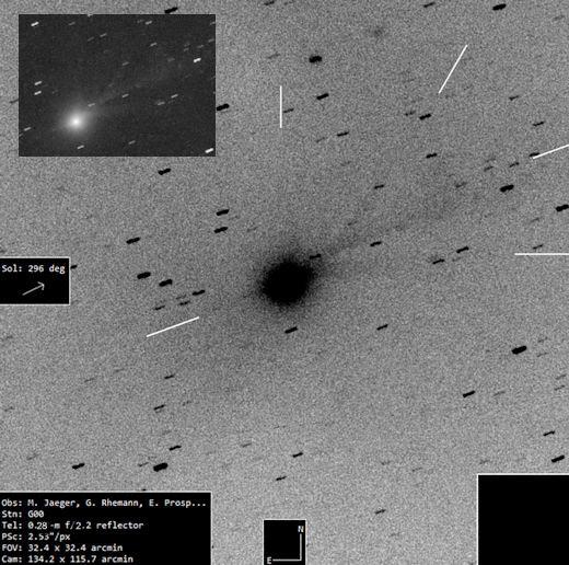 A new Nov. 8 image from Michael Jaeger and colleagues shows four or five tails, including a narrow jet aimed toward the Sun. The comet is exactly where it should be, following the same trajectory as before perihelion. Spaceweather.com is requesting confirming photos.