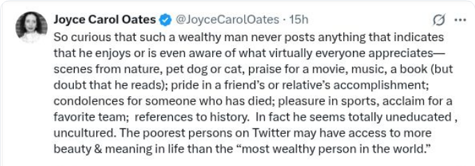 Much has been said about Musk's appalling social media posts. Joyce Carol Oates takes a moment to notice what he *doesn't* post.