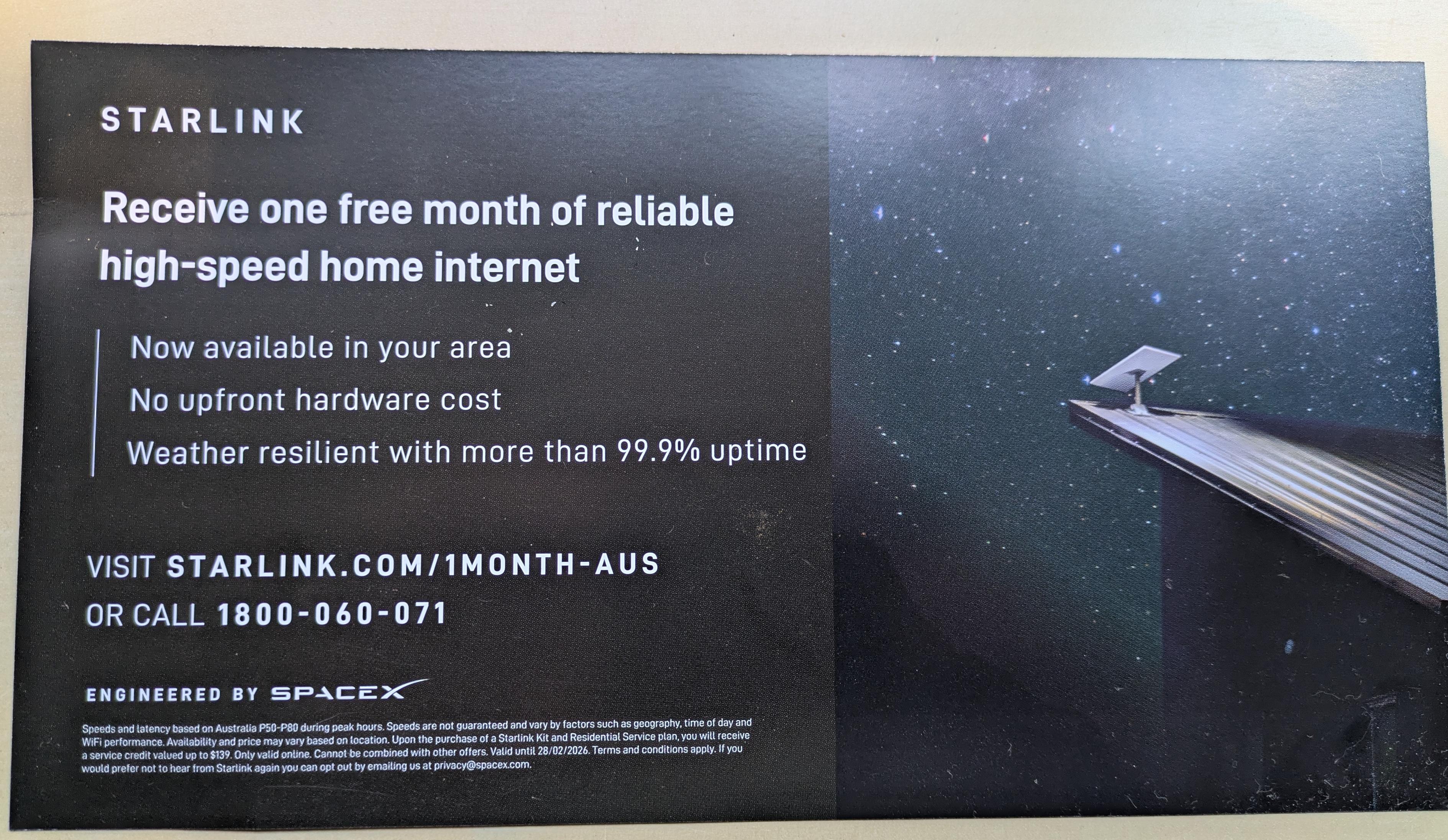 The starlink pamphlet showing the night sky is just fucking cheek. Because the biggest threat to the Australian night sky is of course Starlink.