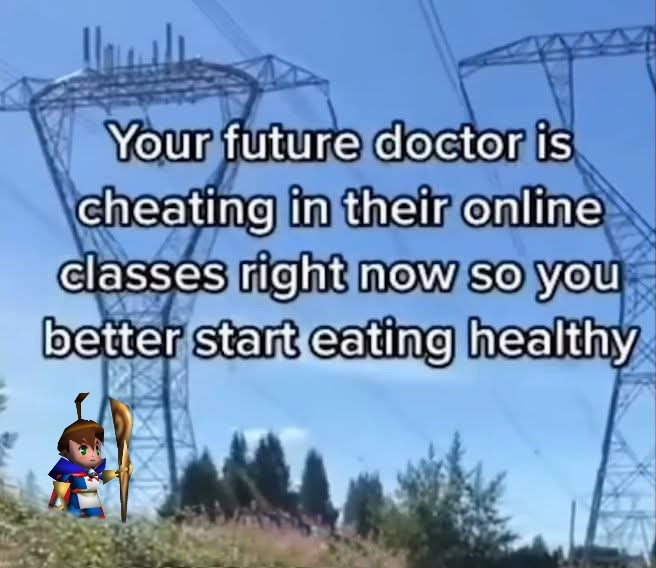 Essa é uma imagem de meme com o personagem Brian do jogo Quest 64 (Nintendo 64). O meme mostra: Cenário: Uma paisagem com torres de transmissão elétrica ao fundo e um céu azul. Texto: "Your future doctor is cheating in their online classes right now so you better start eating healthy" (Seu futuro médico está colando nas aulas online agora, então é melhor você começar a comer saudável) Personagem: O Brian aparece pequeno no canto inferior esquerdo, segurando seu cajado característico. Ele é o protagonista do Quest 64, um jovem aprendiz de mago com cabelo castanho e roupa azul. O meme faz uma piada sobre a qualidade do ensino online durante a pandemia, sugerindo com humor negro que, como muitos estudantes de medicina podem estar trapaceando nas aulas remotas, é melhor cuidar da própria saúde preventivamente. A presença aleatória do Brian do Quest 64 adiciona uma camada de humor absurdo típico dos memes da internet, especialmente considerando que Quest 64 é um jogo meio obscuro e nostálgico que tem uma comunidade de fãs dedicada que gosta de fazer esse tipo de meme surreal.