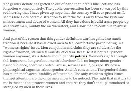 The gender debate has gotten so out of hand that it feels like Scotland has forgotten women entirely. The public conversation has been so warped by this red herring that I have given up hope that the country will ever protect us. It seems like a deliberate distraction to shift the focus away from the systemic mistreatment and abuse of women. All they have done is build trans people up as a straw man, muddy the media waters, and allow men to continue to abuse women.