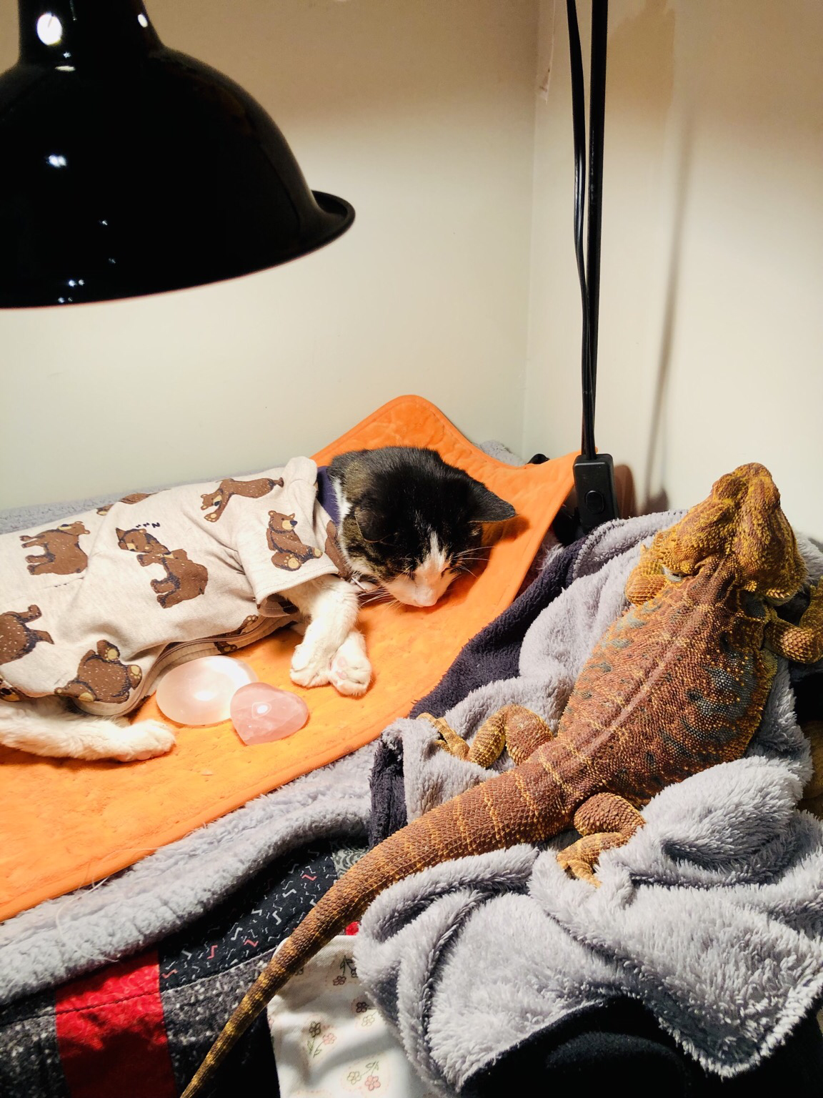 Beside is her brother, bearded dragon basking under the heat lamp.