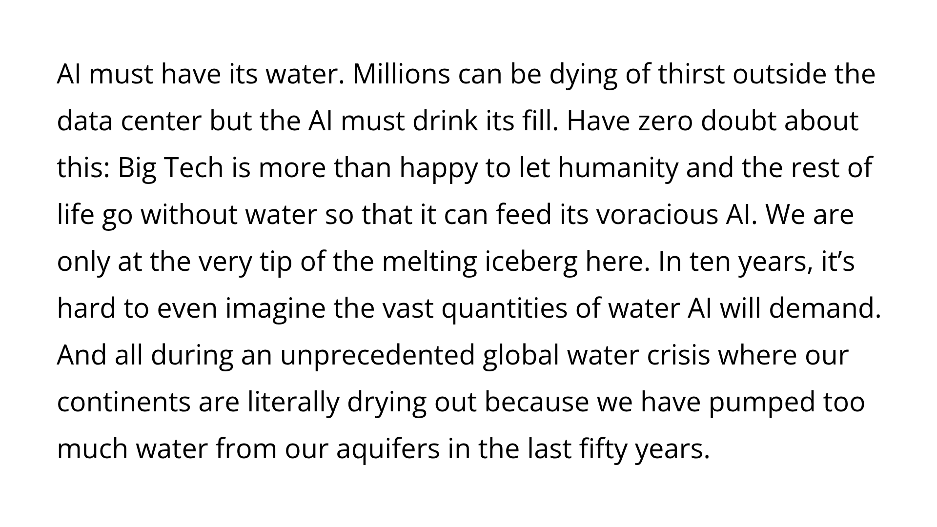 Why does #AI devour so much water? 'Millions can be dying of thirst outside the data center but the AI must drink its fill.' @gerrymcgovern