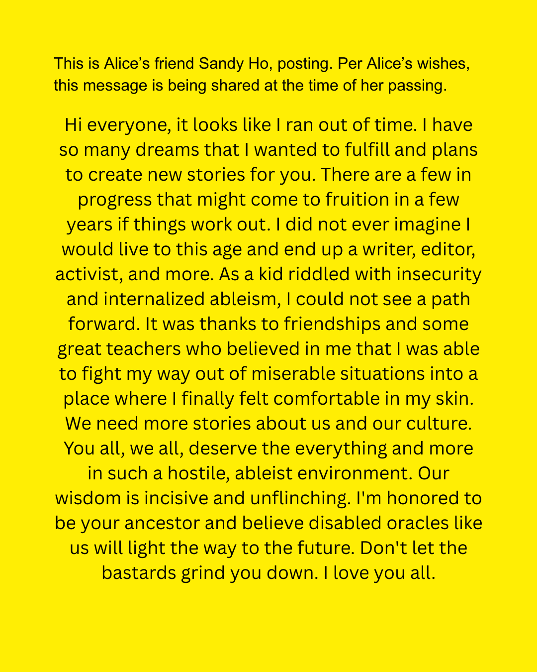 We were Twitter mutuals for a while and we exchanged a bunch of dms about Chinese food and ice cream. She said she could not eat most foods due to her disability but she enjoyed talking about and reading about them. She was also probably responsible for radicalizing me about disability politics. She very kindly sent me a copy of her book. Alice will be missed by everyone who has ever known her, read her, interacted with her.