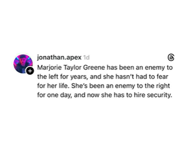 Marjorie Taylor Greene has been an enemy to the left for years, and she hasn't had to fear for her life. She's been an enemy to the right for one day, and now she has to hire security.