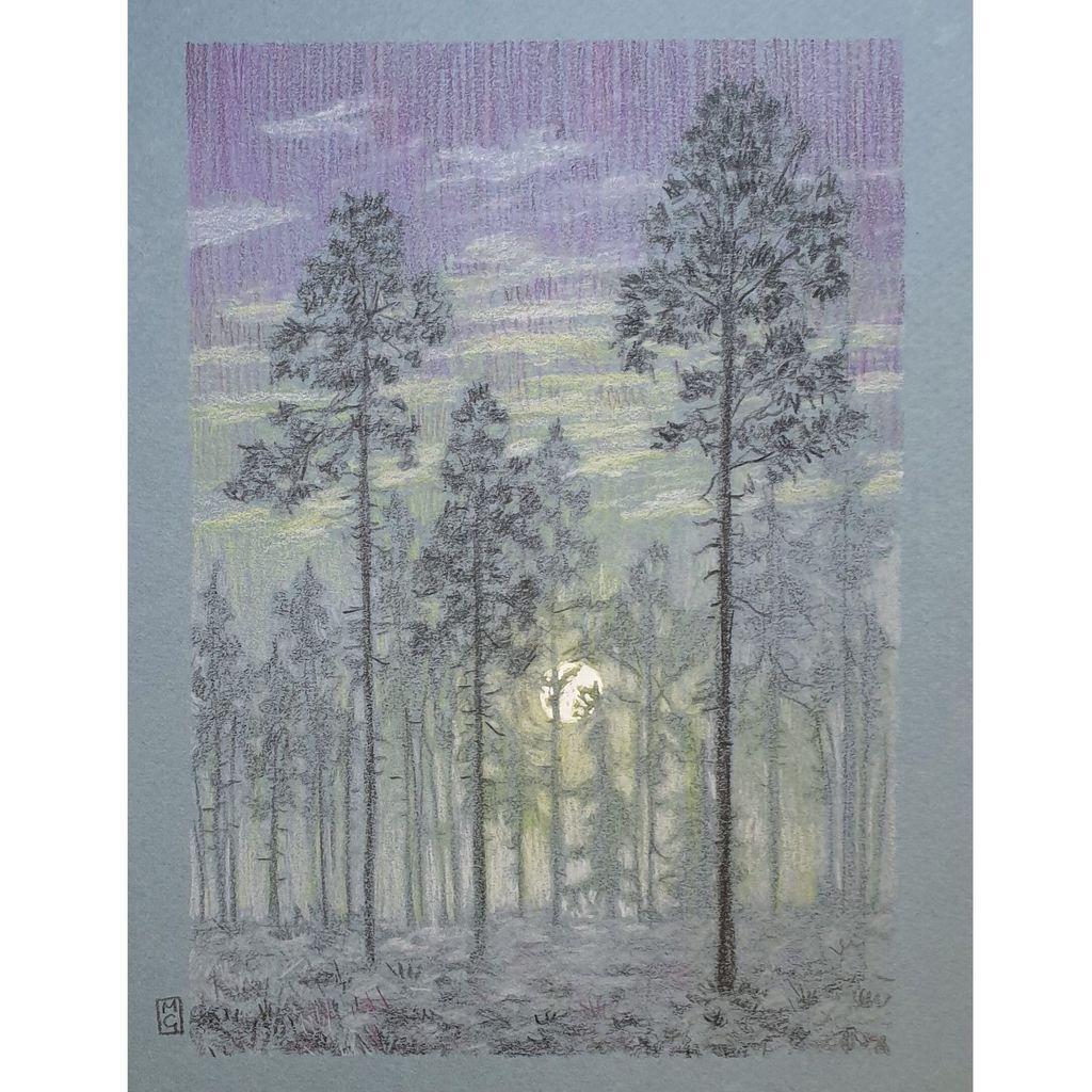 A drawing in a very soft style of tall trees in an evening winter landscape. An original artwork, now available in my Folksy shop...