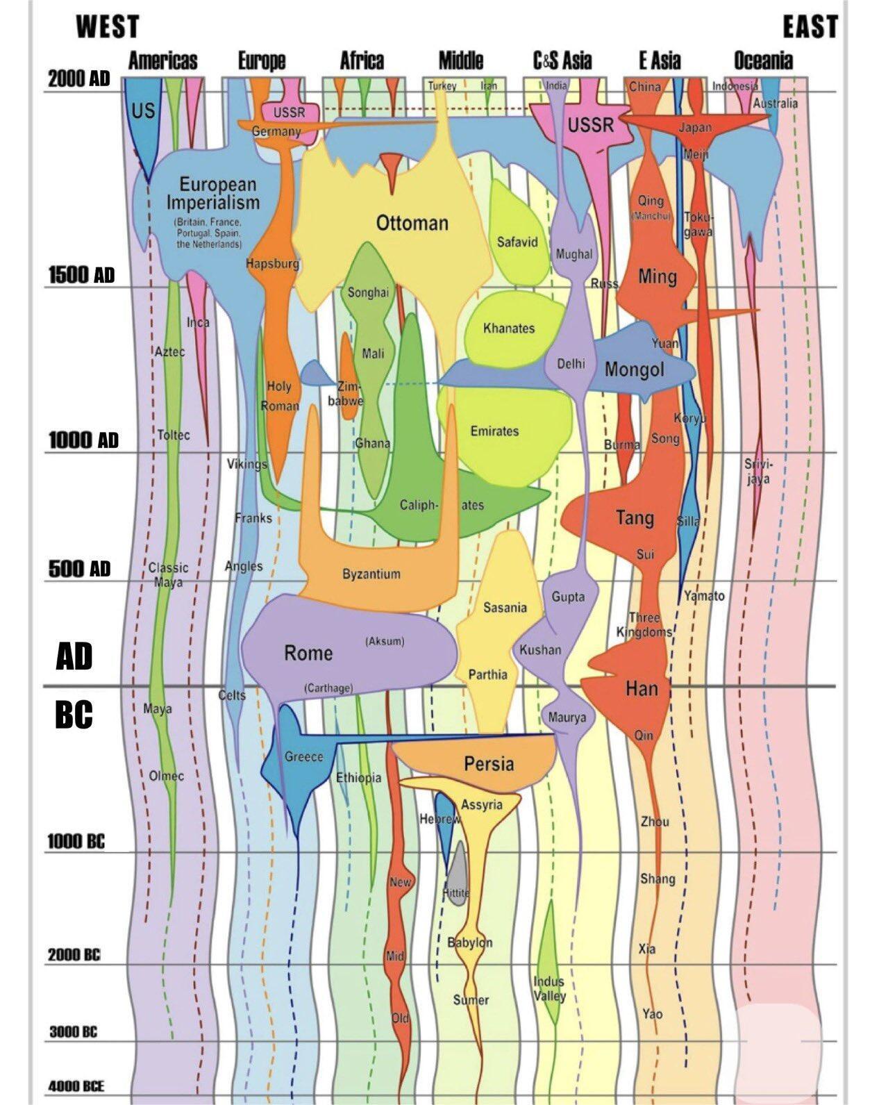 This image is a graphical timeline chart illustrating the history of major empires and civilizations from 4000 BCE to 2000 AD.