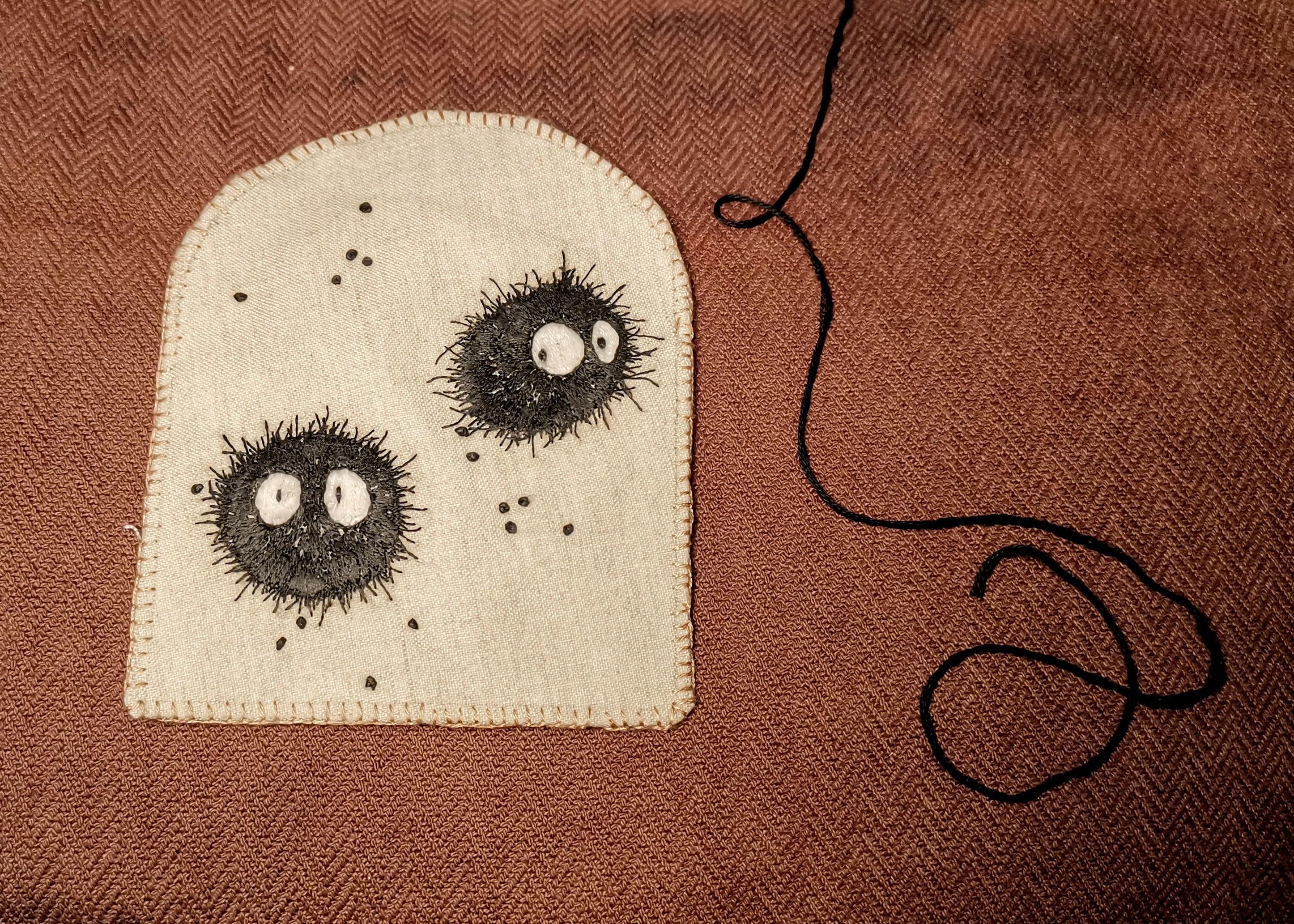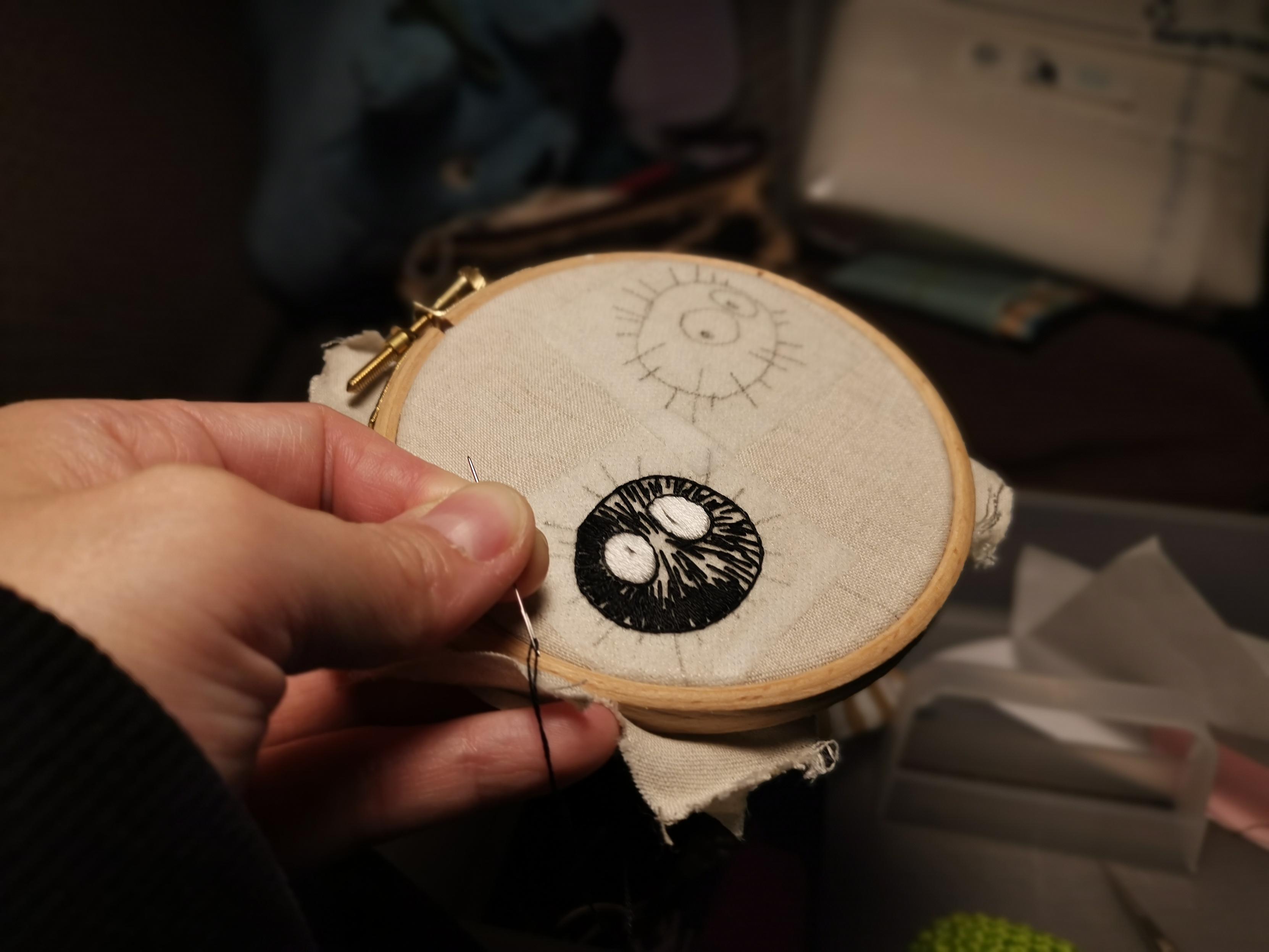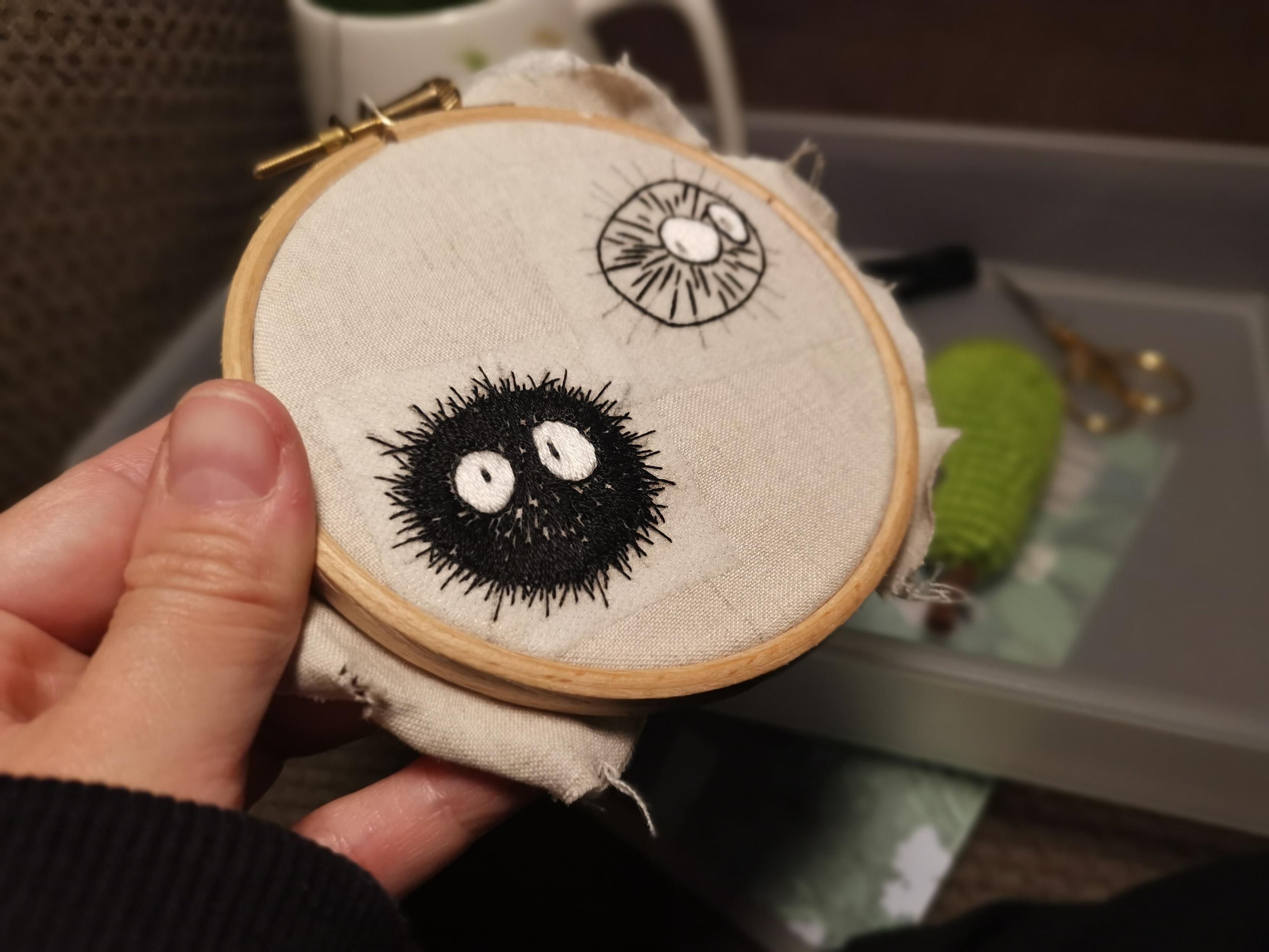 Après deux kits pour apprendre des points de base, je teste de dessiner un motif sur du papier hydrosoluble (en copiant évidemment Miyazaki dont la moitié des persos peuplent ma chambre) et de broder par dessus.