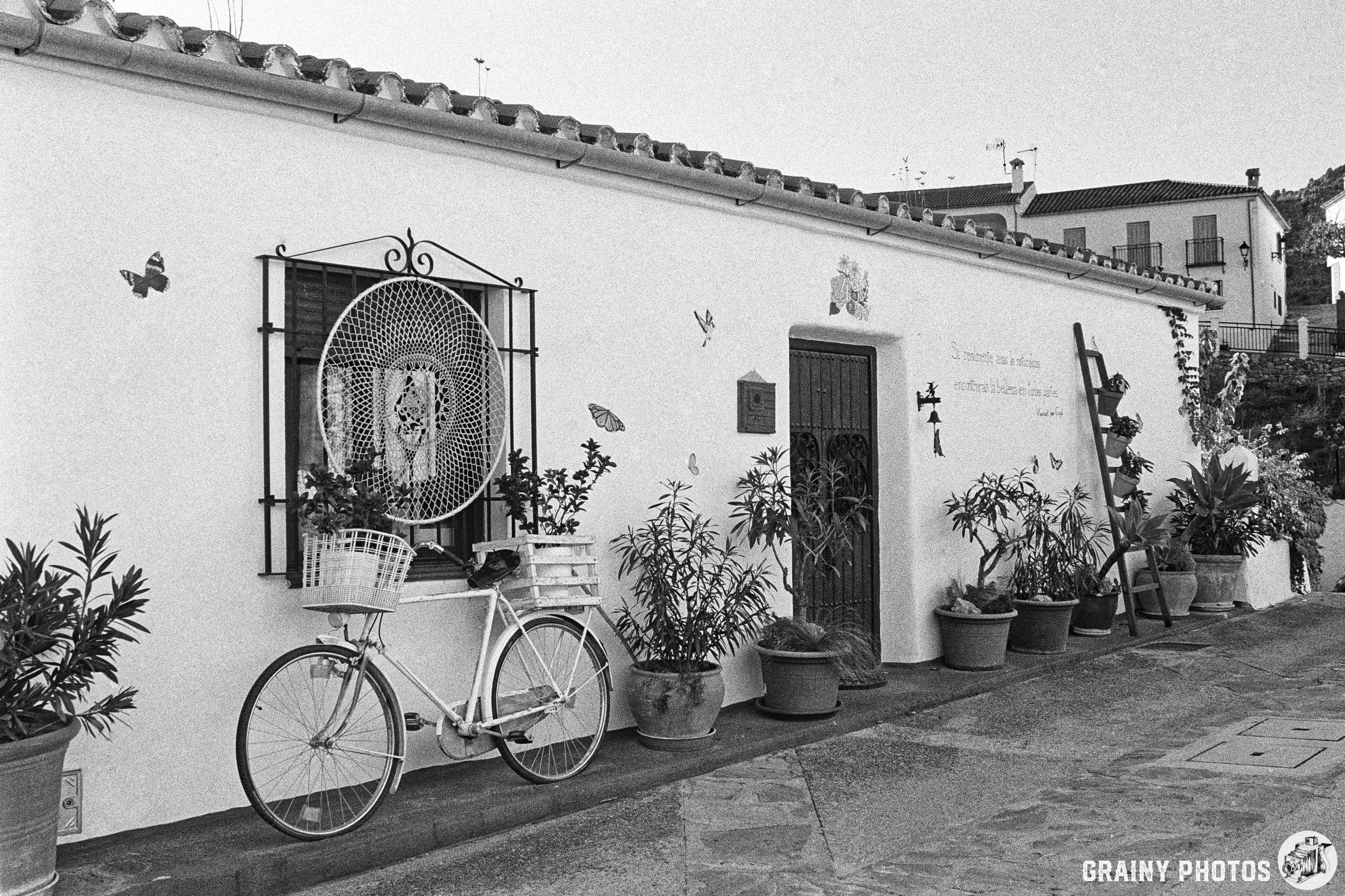 Bringing you daily(ish) film photos: Charming Whitewashed Cottage with Bicycle and Plants