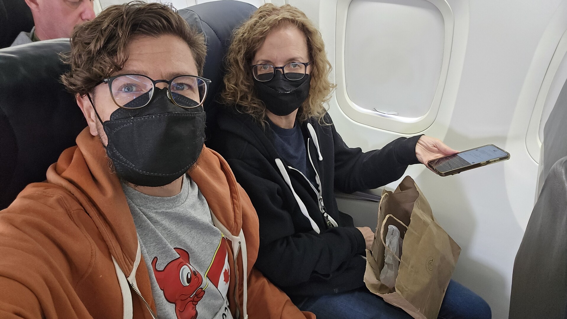 Me and Lisa back on the De Haviland Q400, row 15, first time on the port side of the plane this trip.