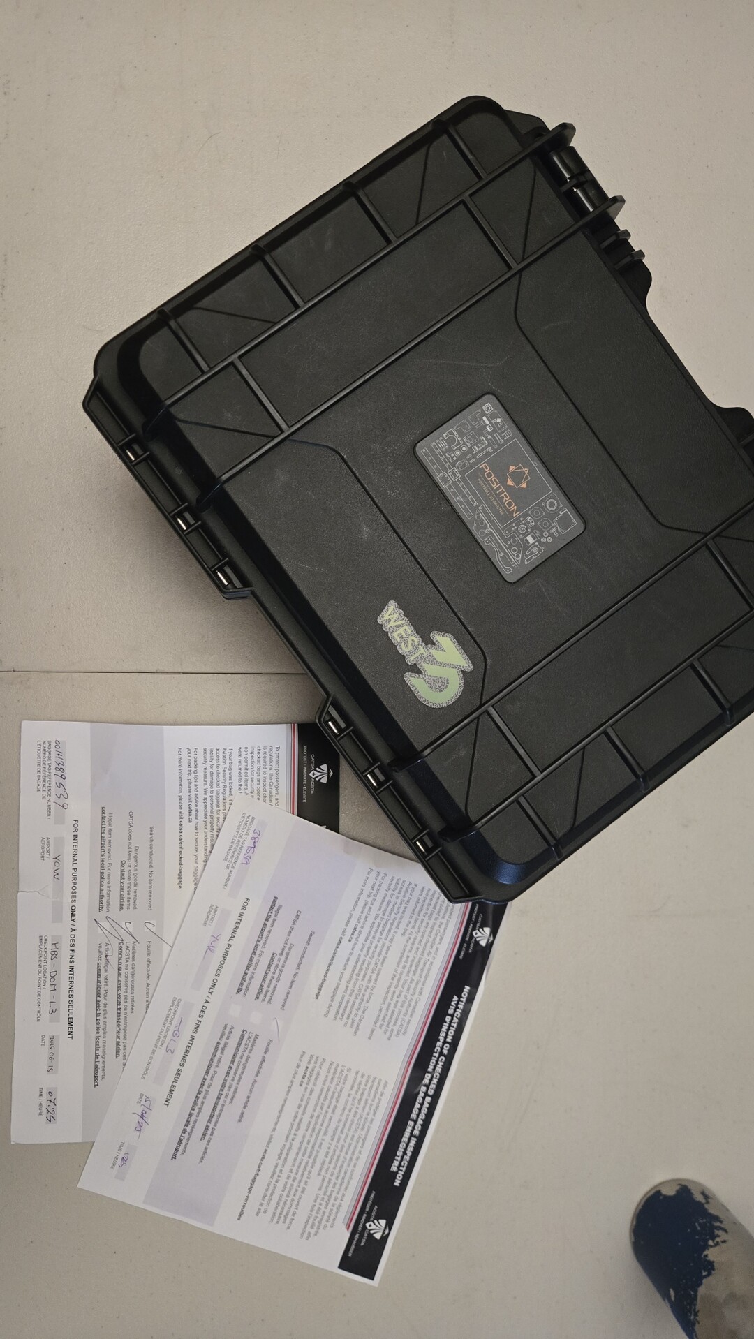 the box for my Positron 3d printer on a table with two slips from Canadian Air Transport Security Authority saying they searched the duffel bag it was in. One looks like they thought about keeping it, then thought again and scribbled that out. Not pictured, the dirty laundry.