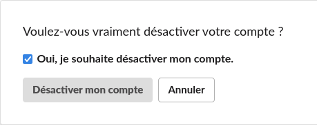 Copie d'écran de la page de désactivation du compte Slack. La case "oui je veux désactiver mon compte" est cochée mais le bouton "désactiver mon compte" n'est pas actif...