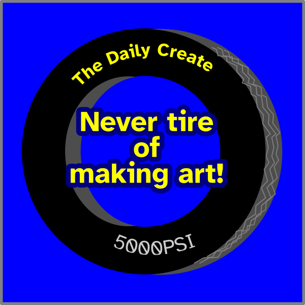 A black tire labeled "the daily create" and "5000 psi" with overlying text in yellow "Never tire of making art!" all in a blue square.