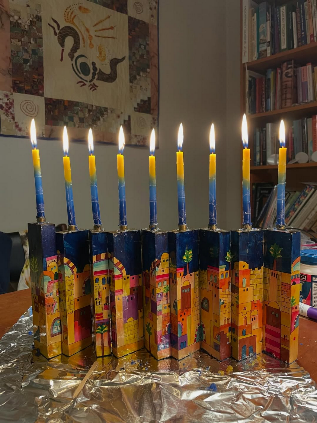 There is a menorah with yellow to blue candles in the foreground. On the wall behind it is a quilt with a dragon inspired by a crop circle. It has bargello sides and light corners, somewhat representing fields. The dragon is appliqued and there is a lot of beading that you cannot see in this picture.