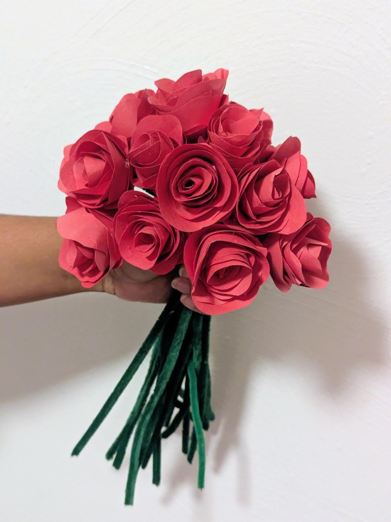 A bunch of red roses made out of paper - and on long green pipe-cleaners held up