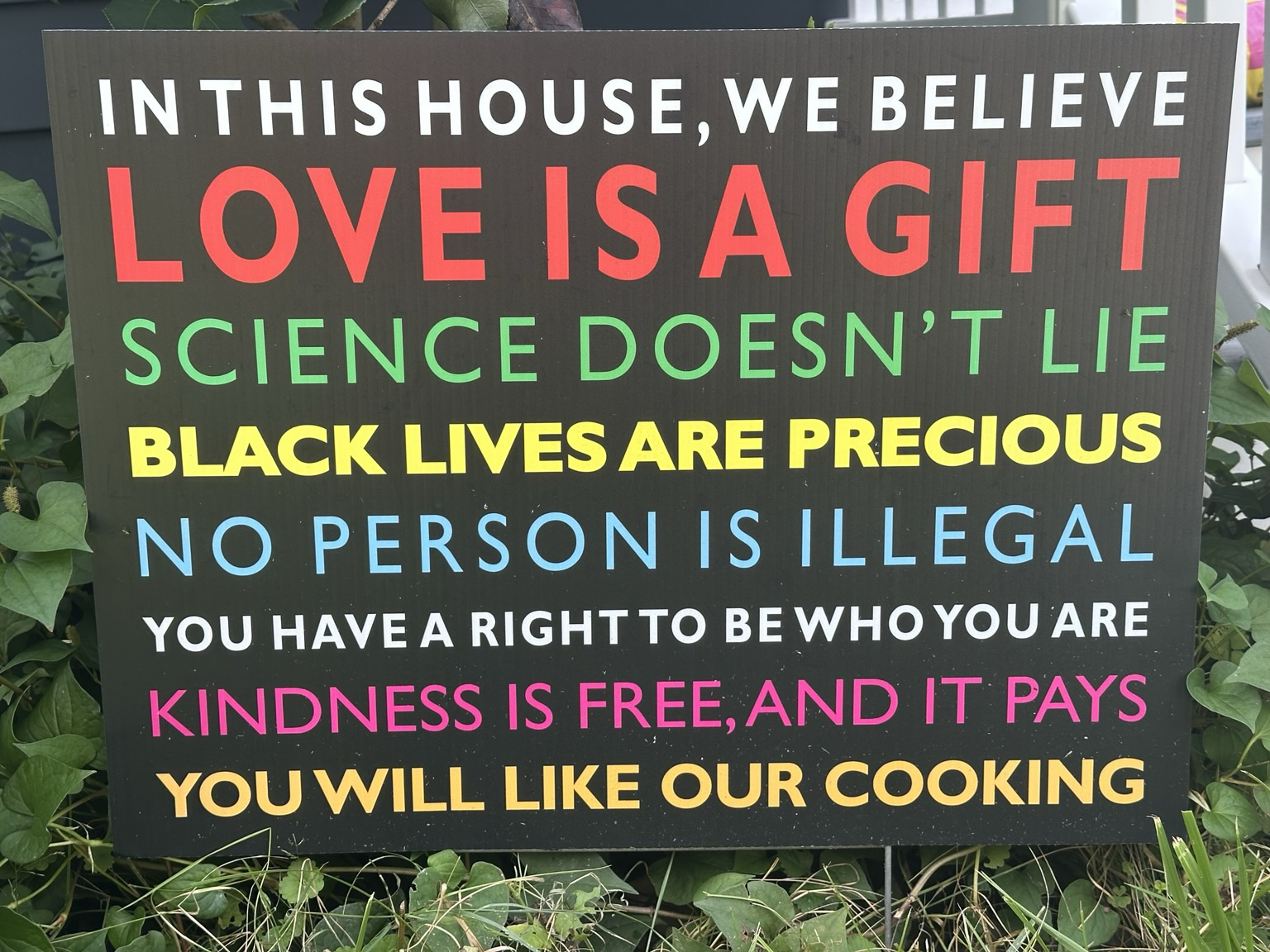 Yard sign reading: In this house, we believe love is a gift science doesn't lie black lives are precious no person is illegal you have a right to be who you are kindness is free, and it pays you will like our cooking