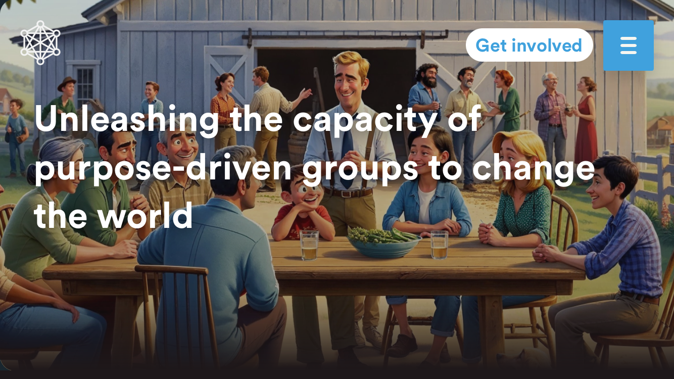 An illustration of 20 people gathered to commune outside a barn on a farm. 10 are gathered in the foreground around a large dining table. 10 are having conversations outside the open doors of the barn. There is a noticeable lack of ethnic and cultural diversity to the people and a kind of generative AI vibe to its aesthetic.
