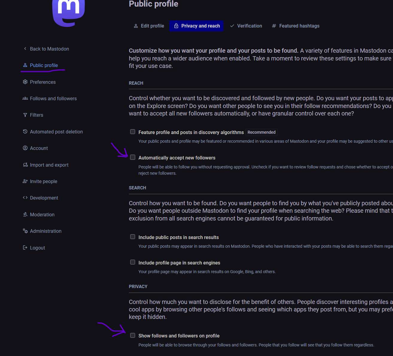 Screenshot of Mastodon Preferences Menu. It shows the Public Profile Preferences under Privacy and Reach. There's a violet arrow pointed to "Automatically accept new follows" box, and another arrow by the "Show follows and followers on profile" box. Both boxes are unchecked.