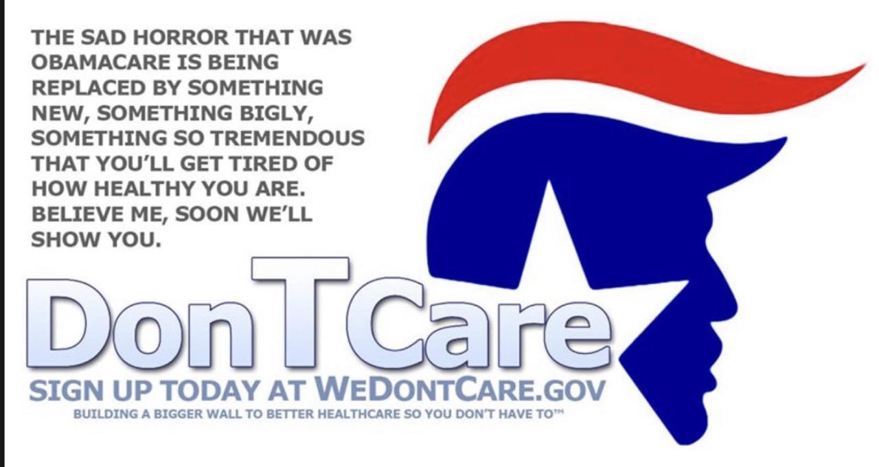 THE SAD HORROR THAT WAS OBAMACARE IS BEING REPLACED BY SOMETHING NEW, SOMETHING BIGLY, SOMETHING SO TREMENDOUS THAT YOU'LL GET TIRED OF HOW HEALTHY YOU ARE. BELIEVE ME, SOON WE'LL SHOW YOU. (Text: Don T Care) SIGN UP TODAY AT WEDONTCARE.GOV BUILDING A BIGGER WALL TO BETTER HEALTHCARE SO YOU DON'T HAVE TO™