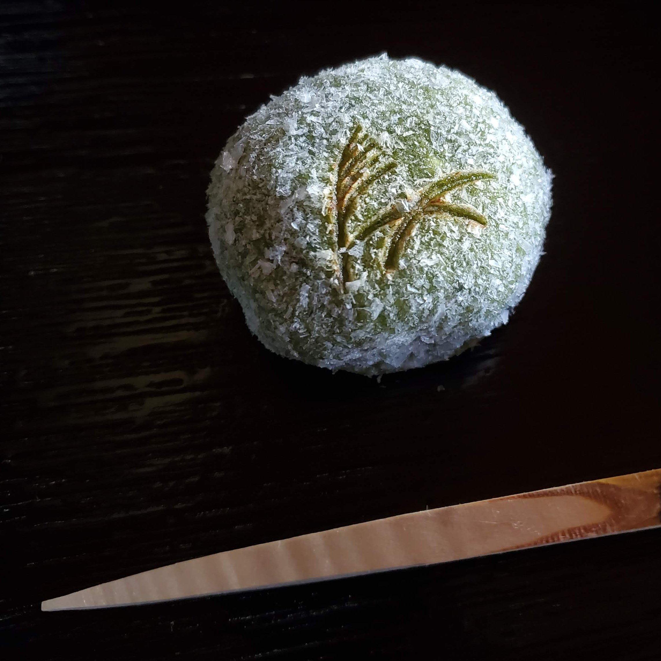 A monaka sweet in the shape of a thatched hut.