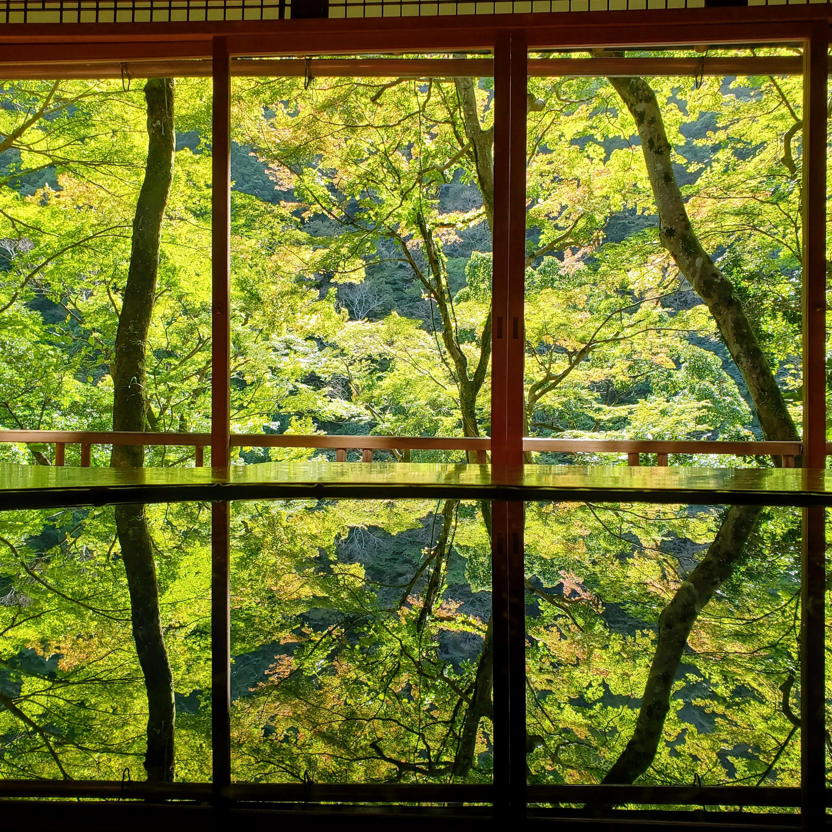 Vivid green backdrop of foliage at Yusai-tei.
