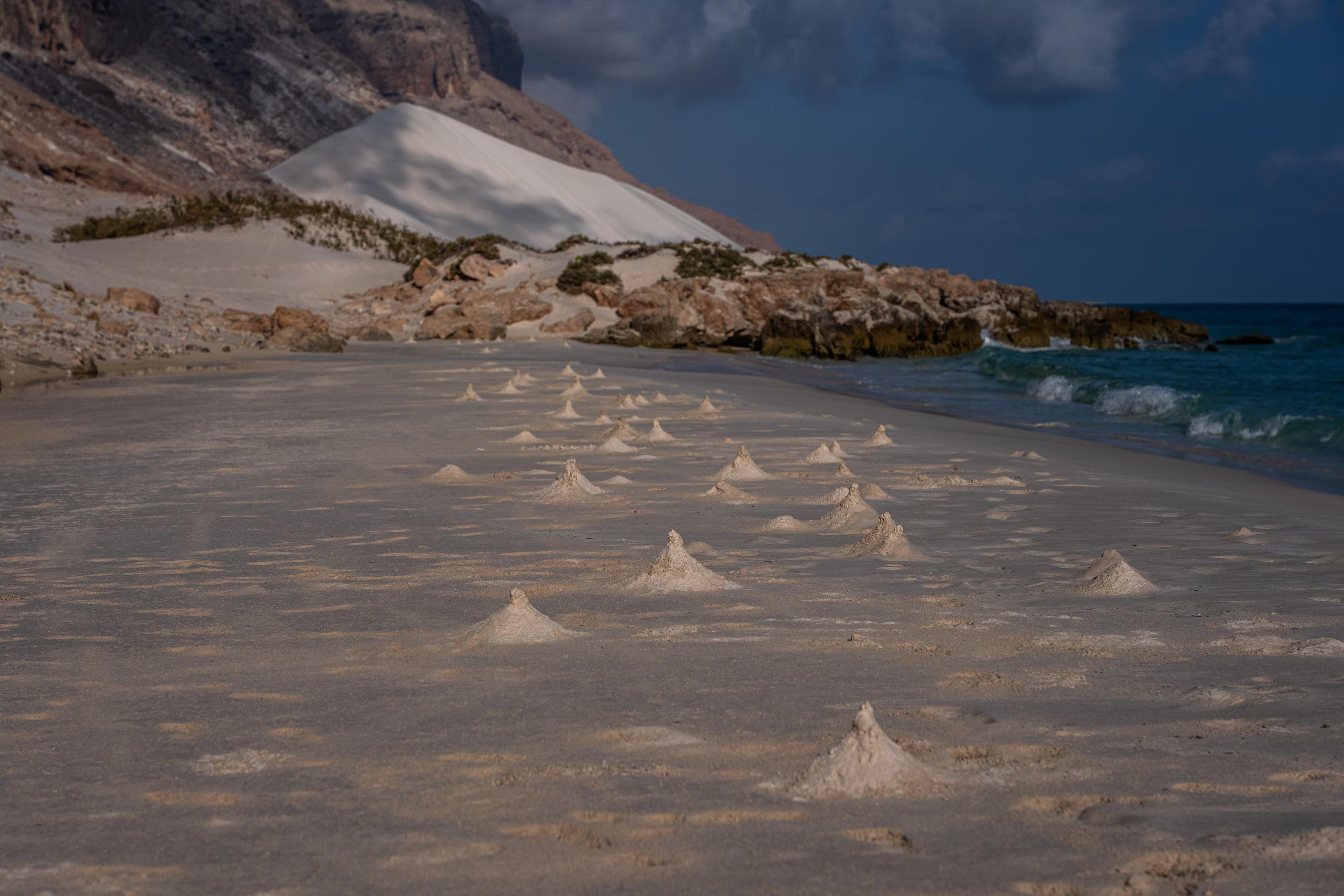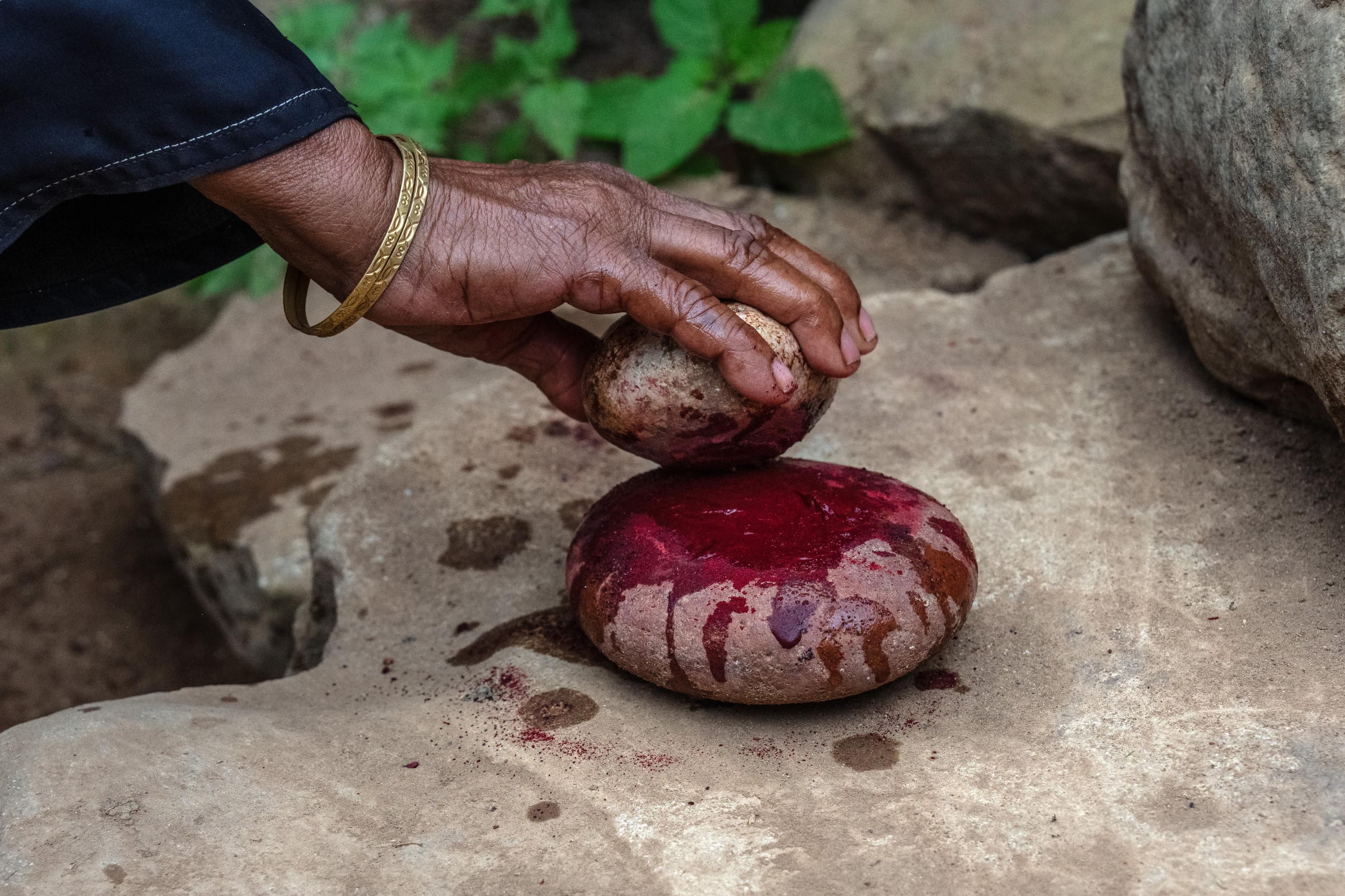 A woman demonstrates how to grind the resin from a dragon blood tree.