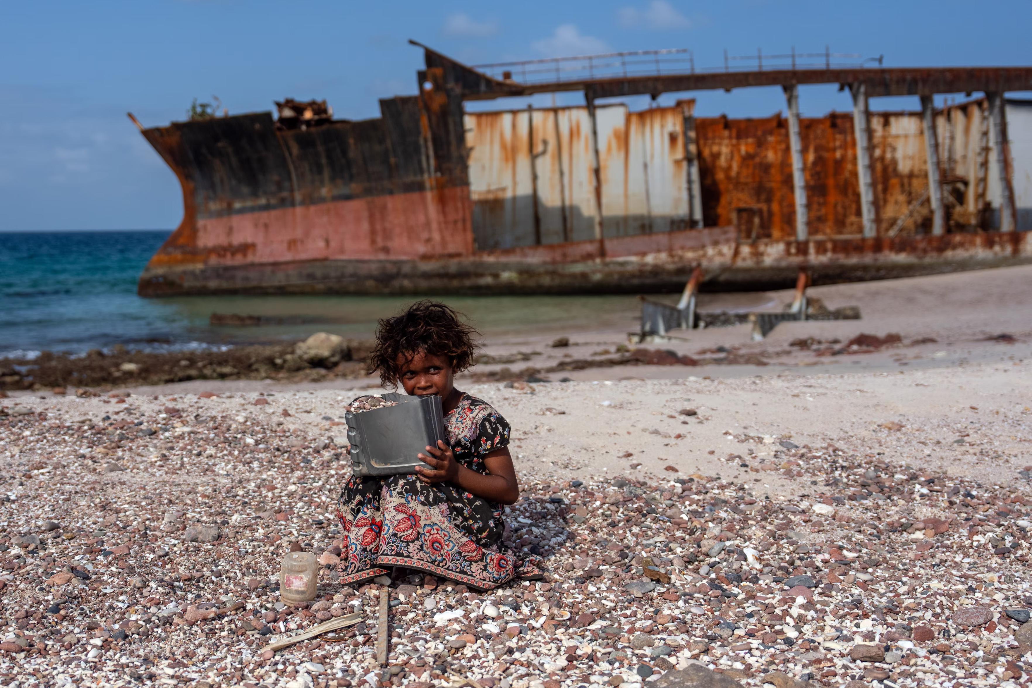 A girl pauses while collecting shells on the beach next to the wreckage of a ship on Socotra