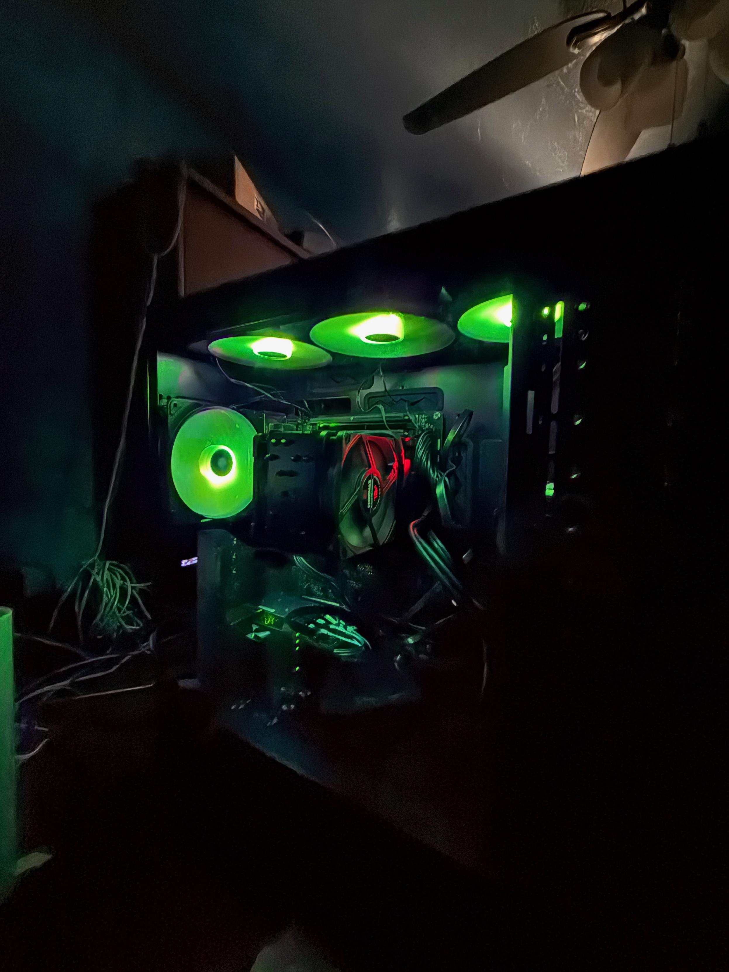 @madeindex here is when it's on green lights. The room lights were off. About the only way you can see in it. I'm not good at cable management but the case size allowed for quite good cable management all considered. Those are 2x140mm, 1x120mm at the top and 1x140mm at the back. It'll be 4x120mm at front and top and 1x140mm later on.