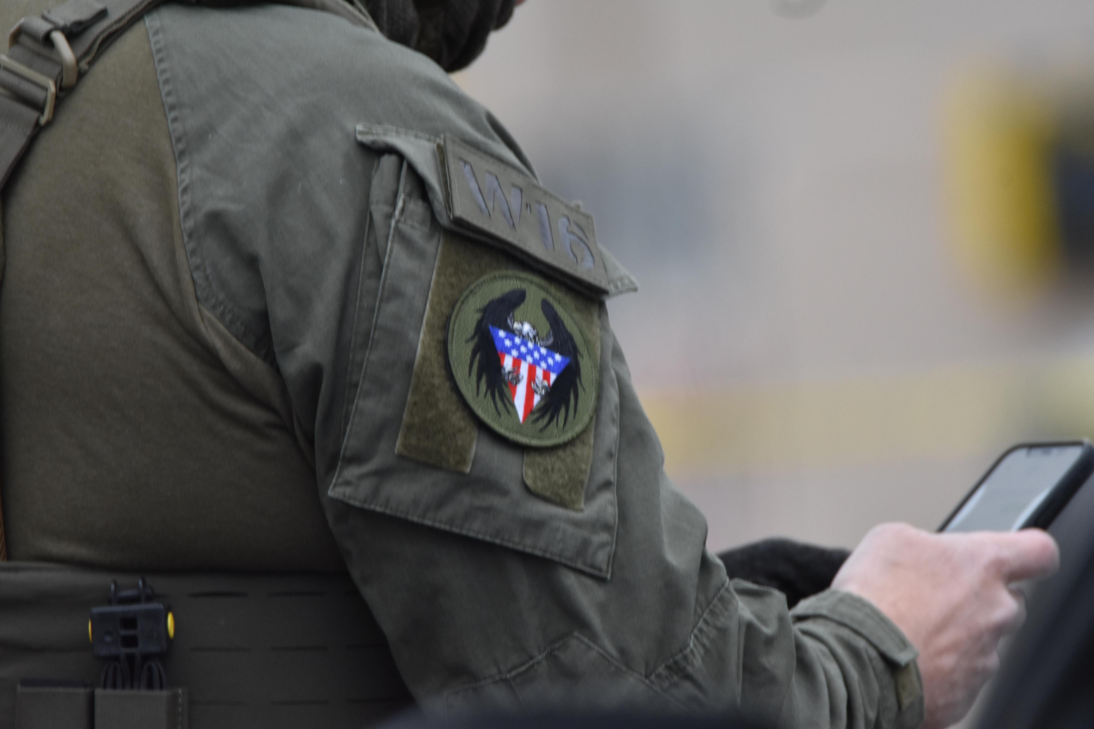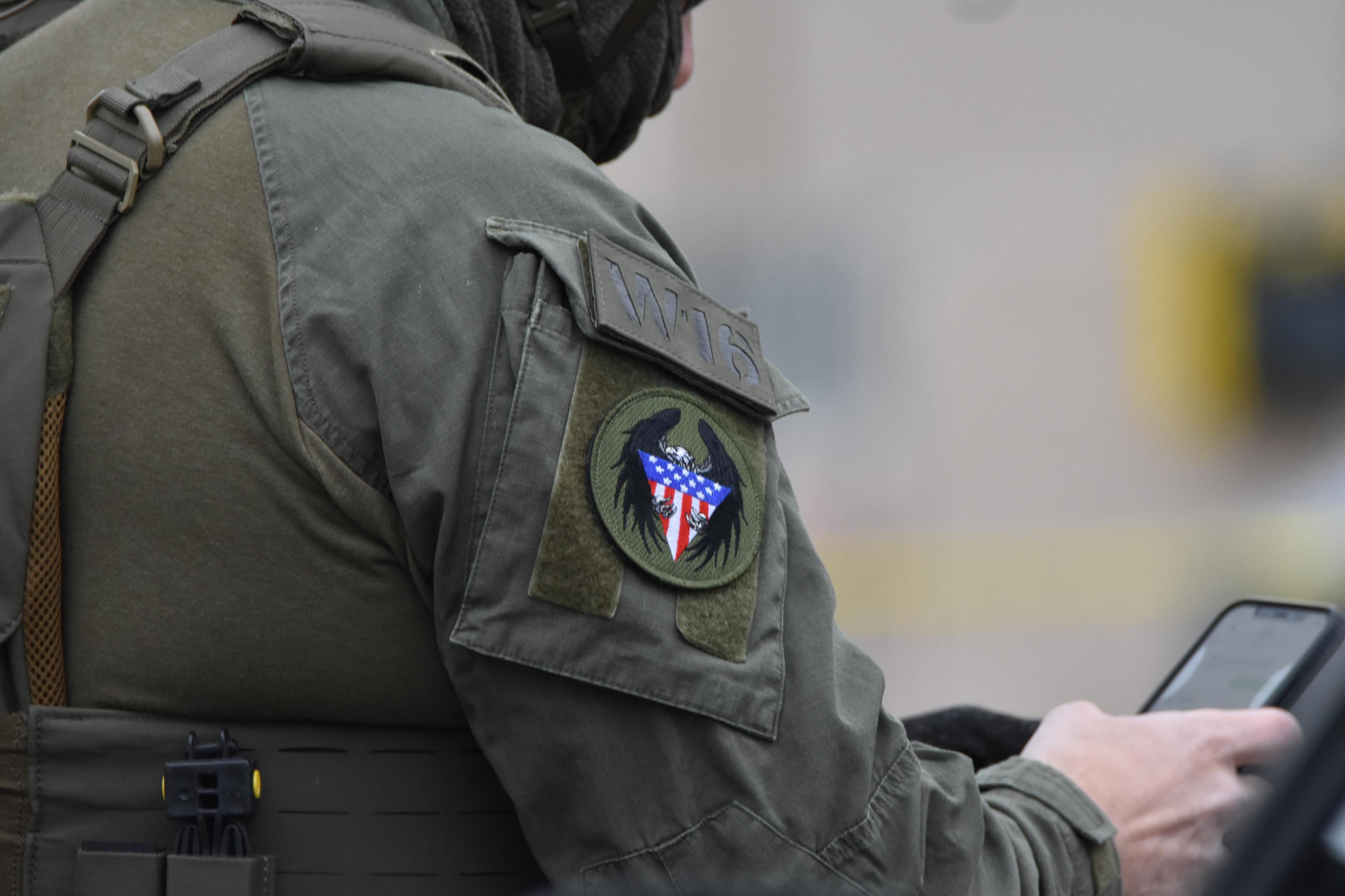 Female Federal agent (with long blonde hair and brown knitted cap reading FBI and vest reading FBI) at today's immigration action at Bro-Tex in St Paul.
