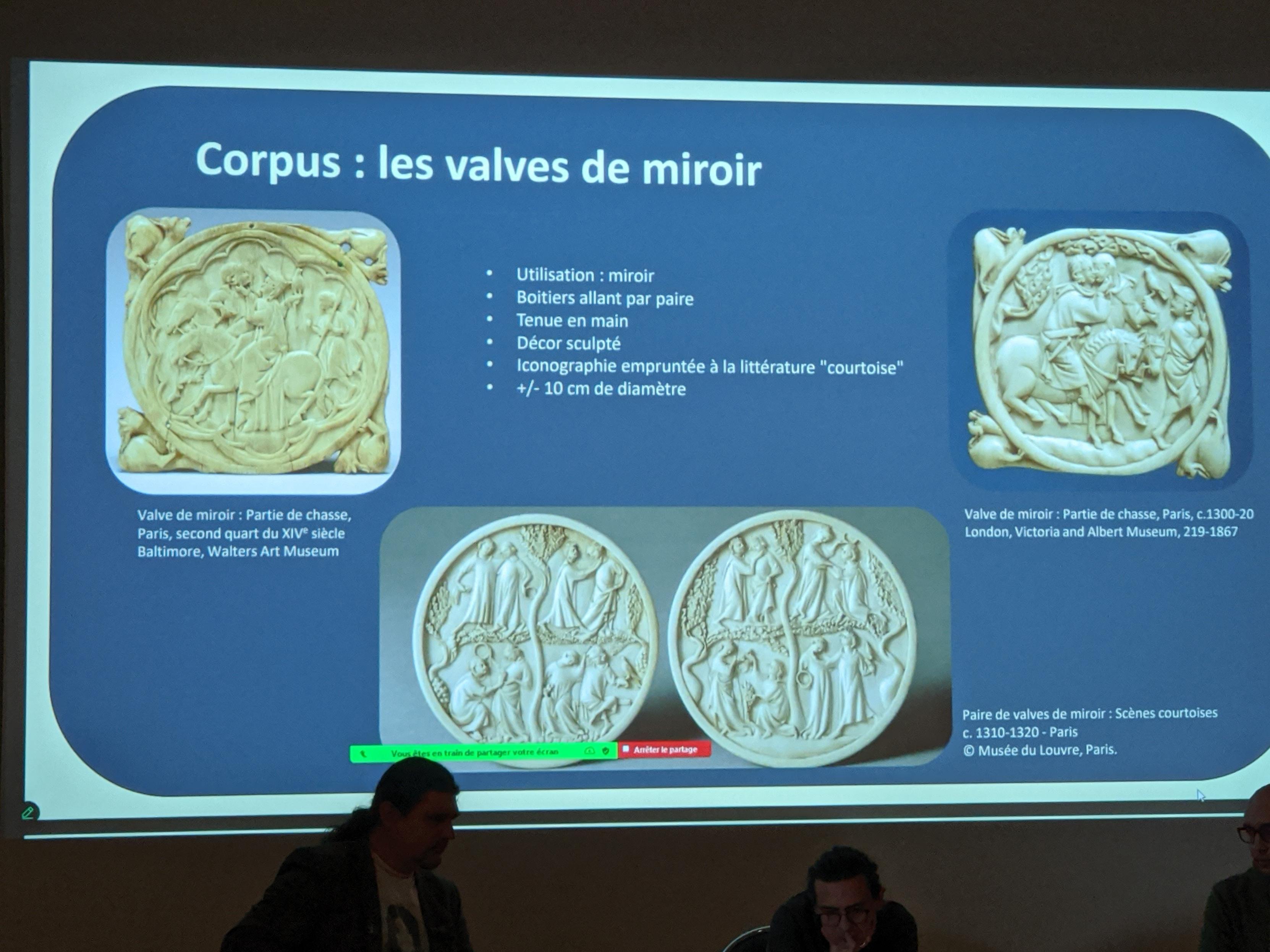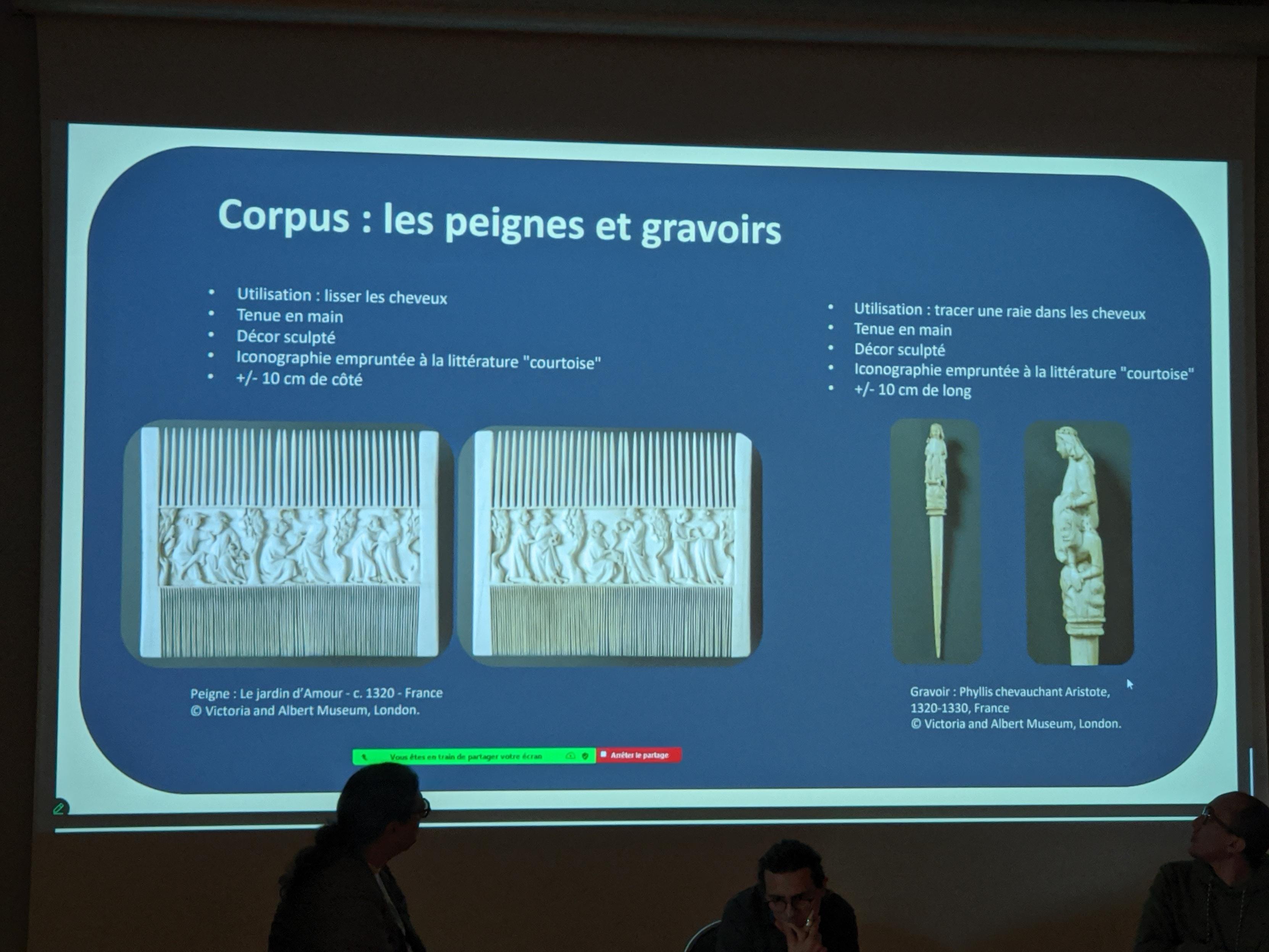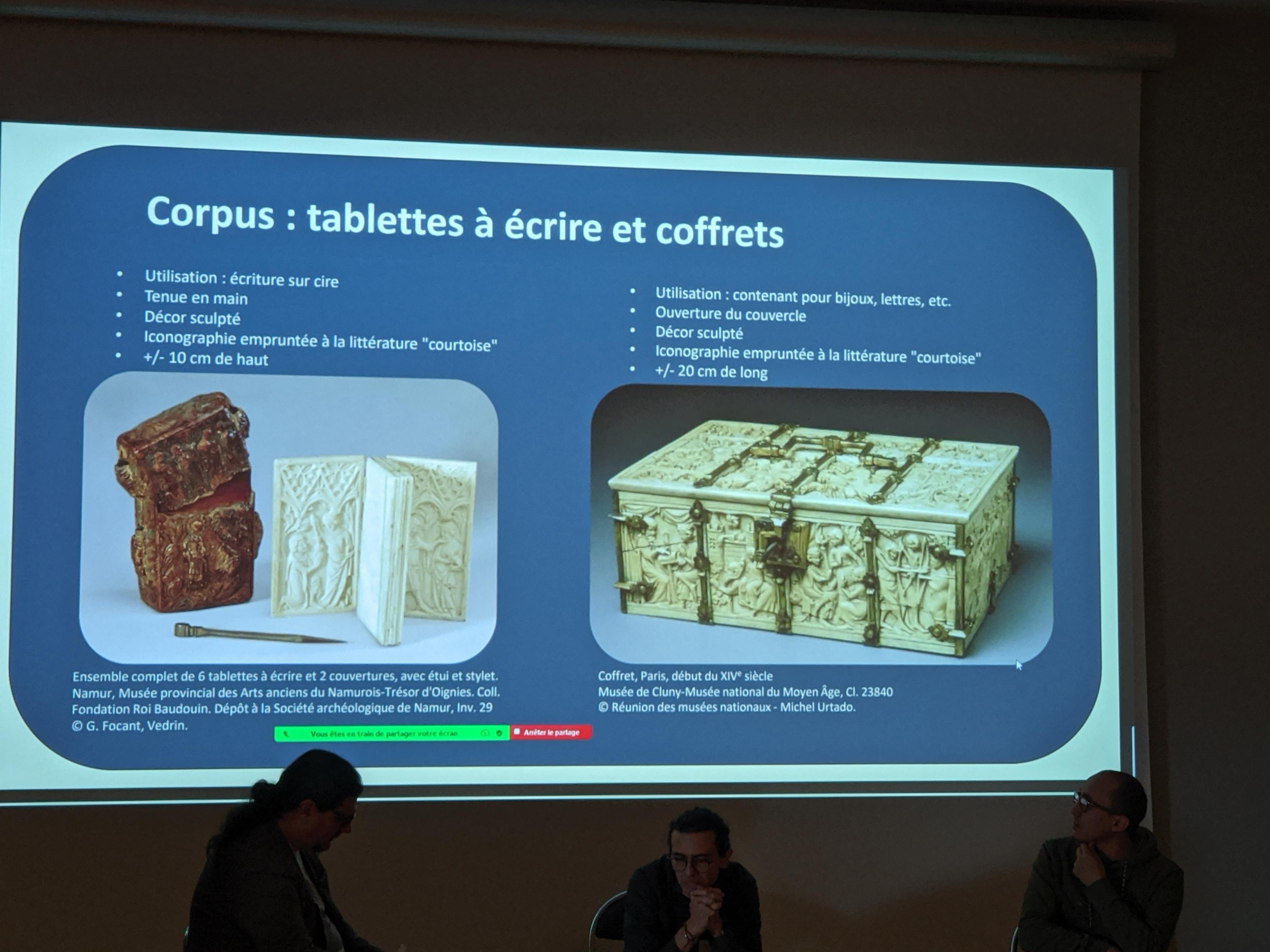 @CCeH Le rythme est soutenu, les présentations sont assez courtes : on enchaîne avec une table ronde sur l'interdisciplinarité. Maud Brochard de l'Unil (Lausanne) prend la parole pour parler de tracéologie, de RTI et d'ivoires gothiques.