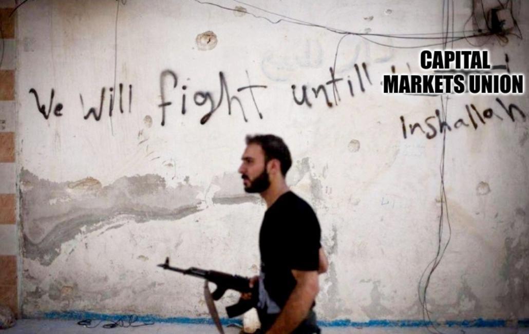 Old meme about the neverending wait for CMU. A young bearded man walks with his AK47 by a white wall. Wall inscription in black letters: "We will fight untill Capital Markets Union Inshallah"
