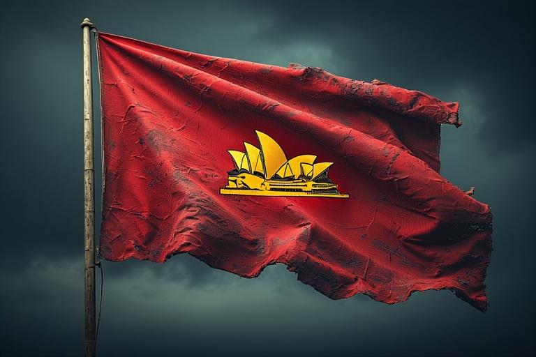 An Australia Rouge flag. Yellow Sydney Opera House on red background. CC0 by Karel 'Clock' K. (unedited AI output).