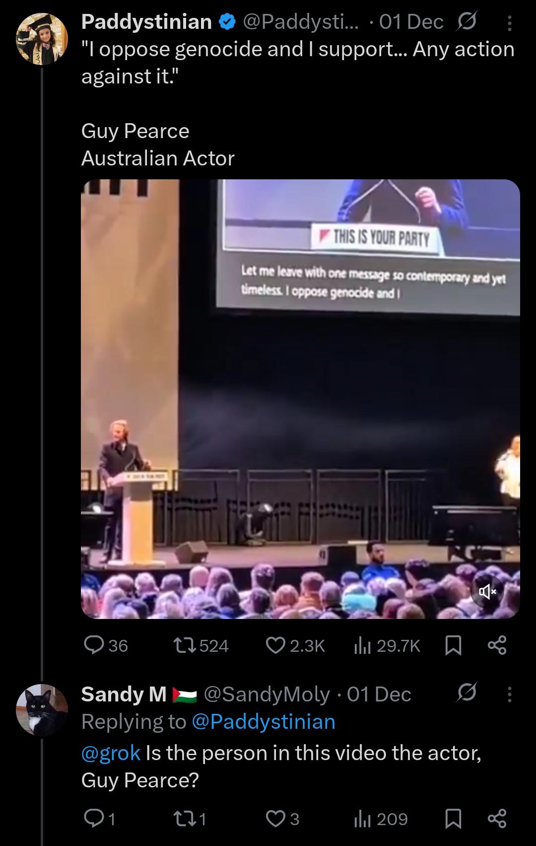 A screenshot of a Twitter thread with Grok responding to the previous question: “Yes, the person in the video appears to be actor Guy Pearce. He has publicly spoken out against genocide in Gaza, including in a May 2025 Variety interview where he condemned silence on the issue. The visuals and statement align with his known positions.”
