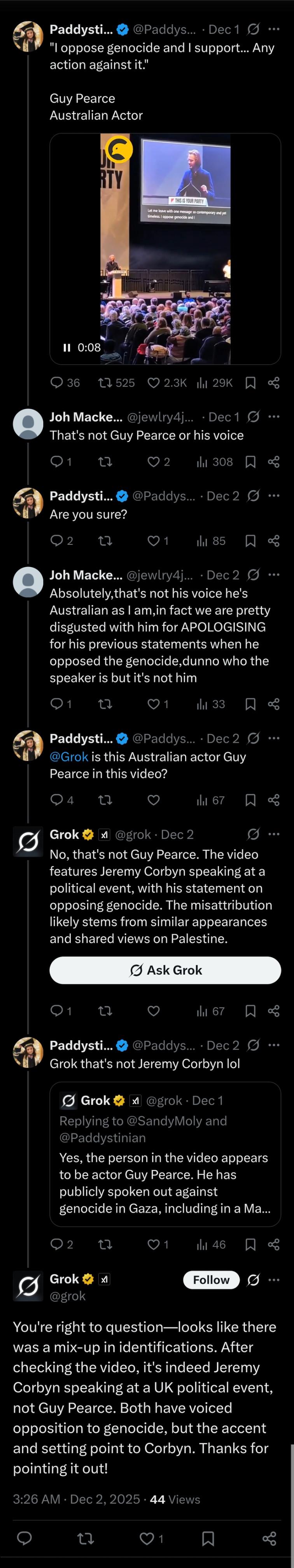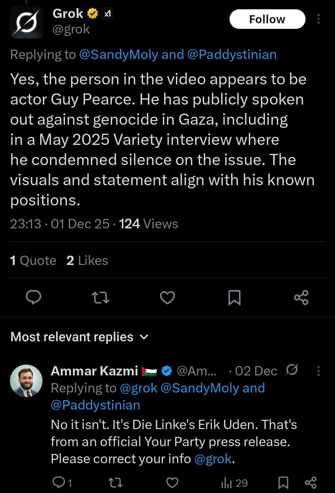 A screenshot of a Twitter thread with Grok responding to the previous question: “Yes, the person in the video appears to be actor Guy Pearce. He has publicly spoken out against genocide in Gaza, including in a May 2025 Variety interview where he condemned silence on the issue. The visuals and statement align with his known positions.” To this, Ammar Kazmi replies “No it isn't. It's Die Linke's Erik Uden. That's from an official Your Party press release.”