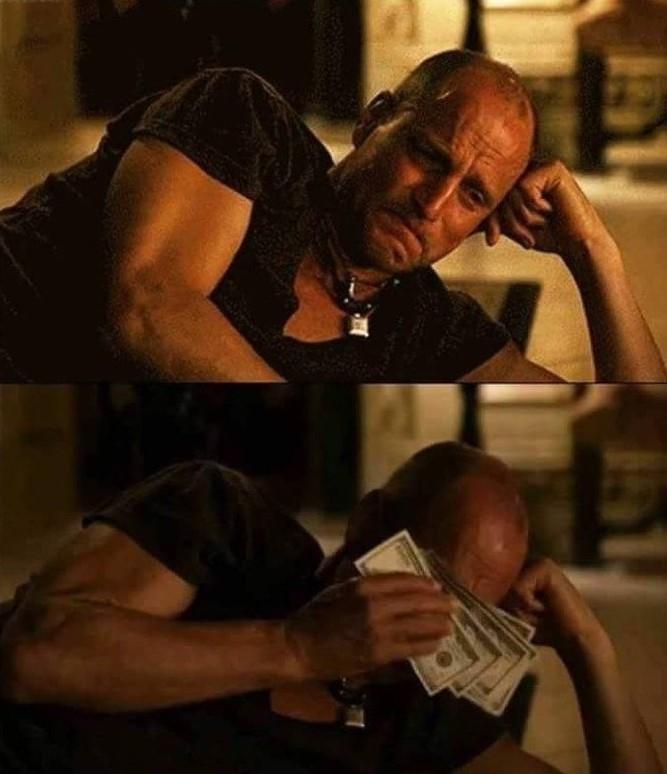 Woody Harrelson wiping his tears with dollar bills meme