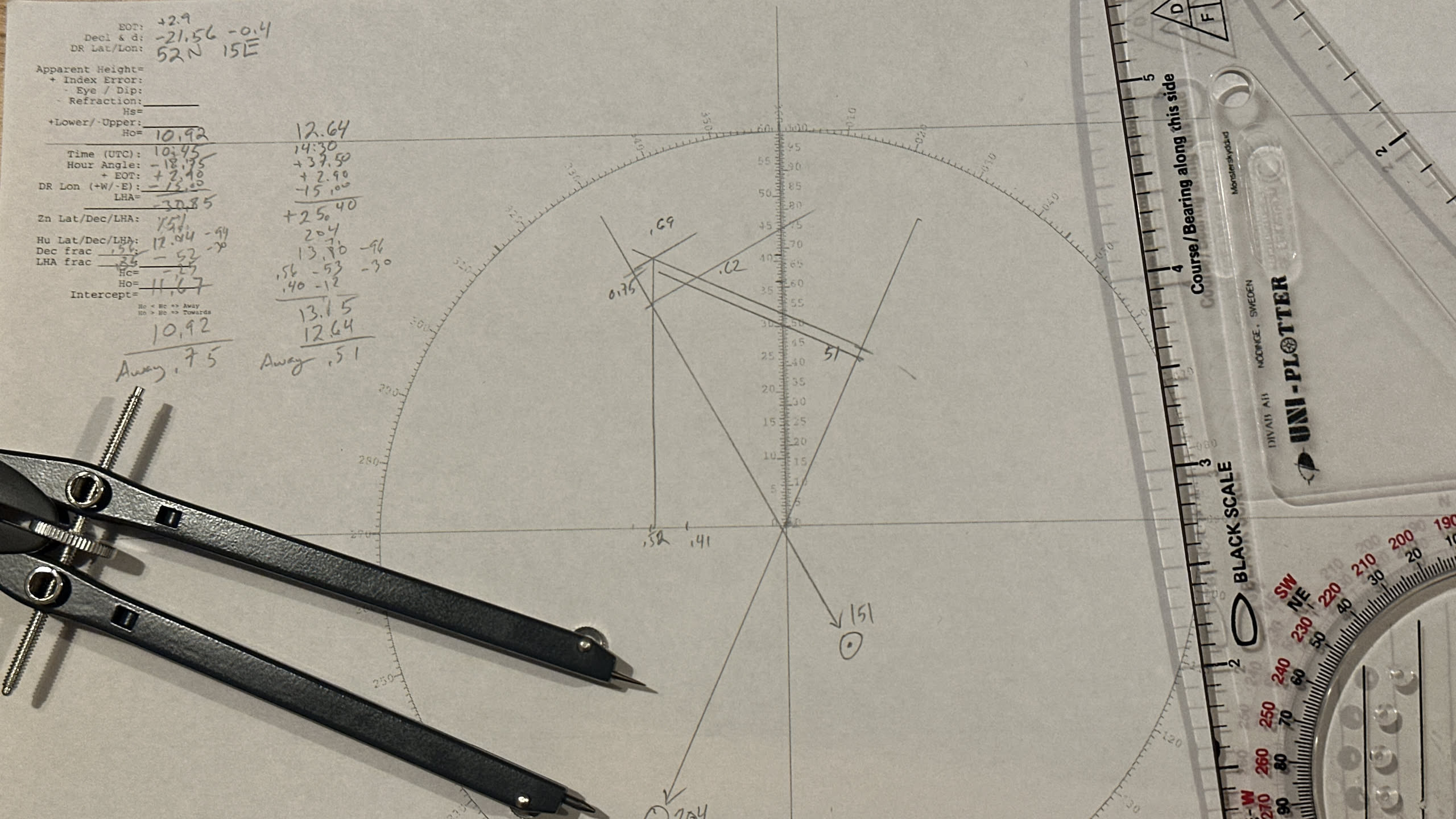 lines of position plotted on a piece of paper with scribbled math showing the calculations and tools like a compass, parallel ruler and triangle near by