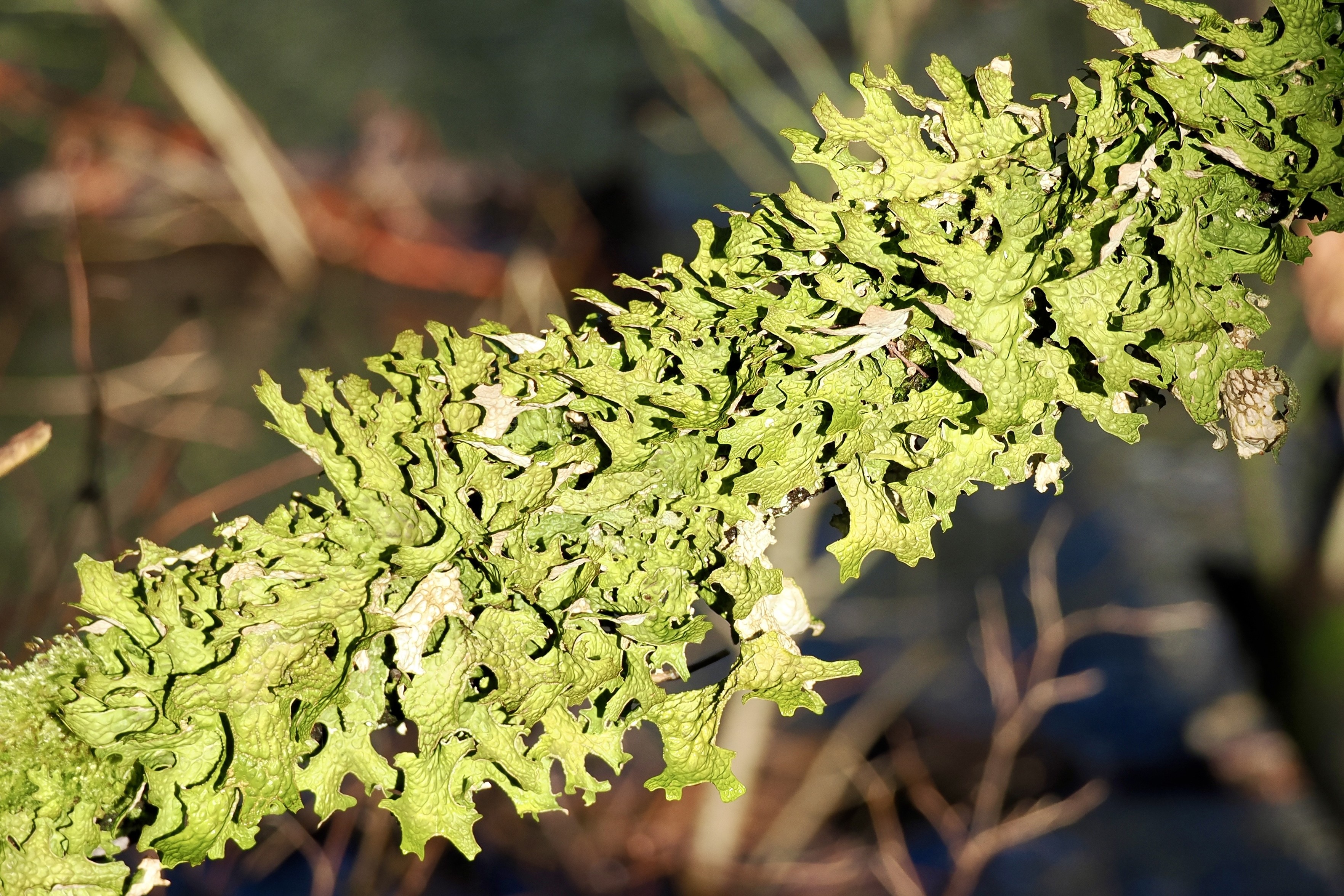 A twig, unseen here due to the incredibly verdant growth of leafy (nearly spinach like) lichen, runs diagonally across the frame