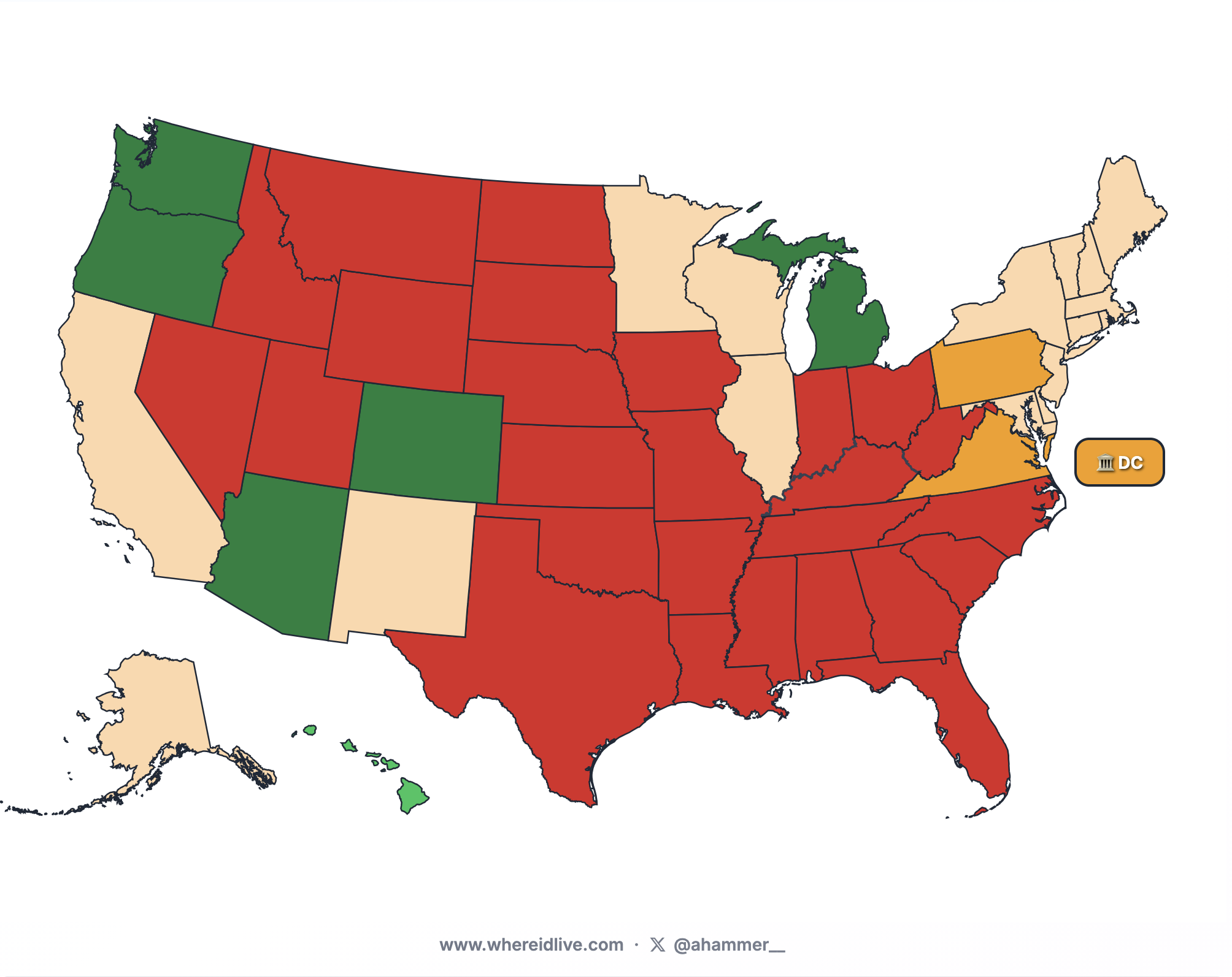 Maybe: California, Alaska, New Mexico, Minnesota, Wisconsin, Maryland, Delaware, New Jersey, New York, Rhode Island, Connecticut, Massachusetts, Vermont, New Hampshire, Maine