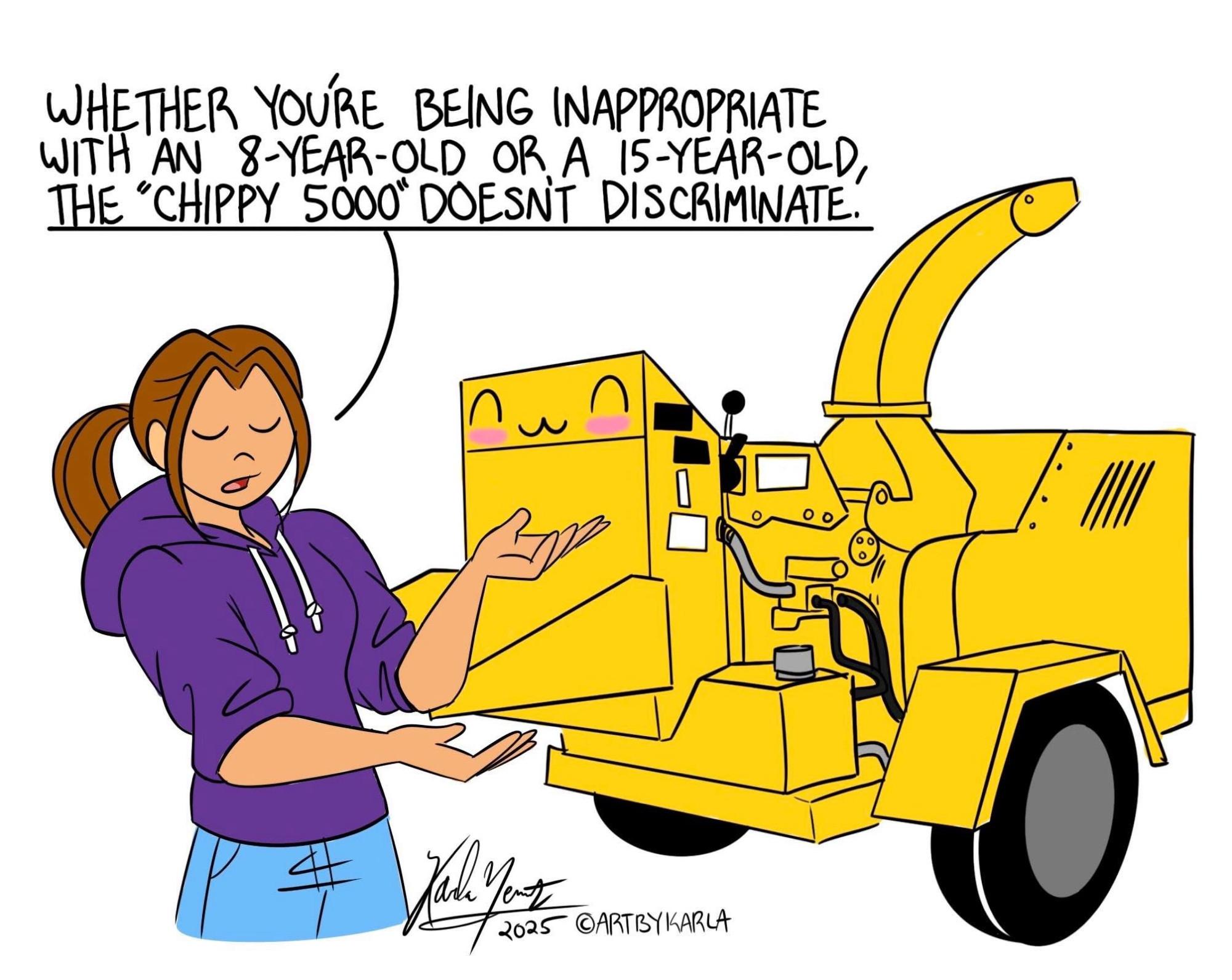 Cartoon by Karla Nemitz with a woman in a purple hoodie and jeans standing next to a yellow wood chipper with an uwu face She says "Whether you're being inappropriate with an 8 year old or a 15 year old, the 'Chippy 5000' doesn't discriminate"