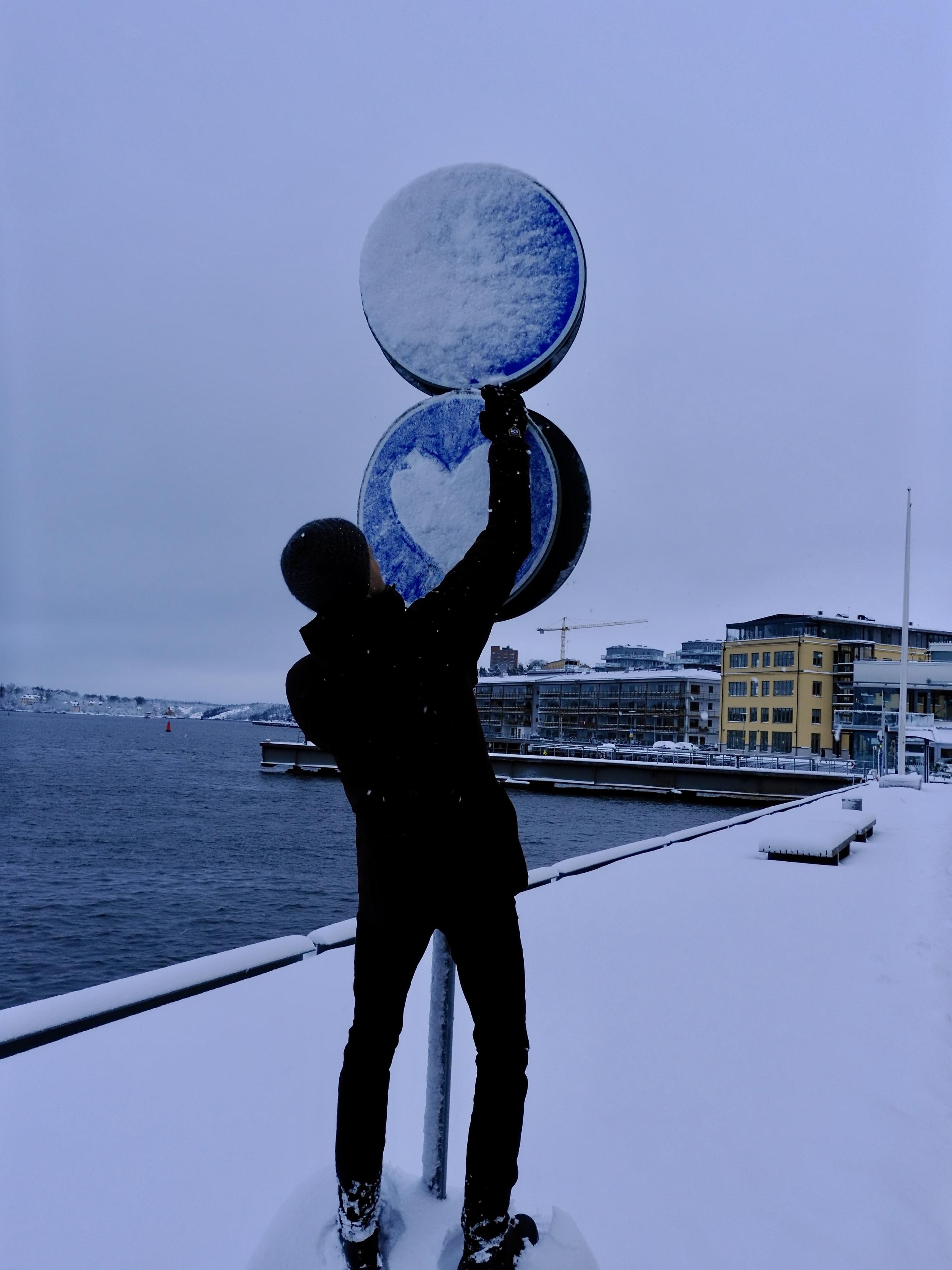 alt A person in a coat and beanie is standing on a snowy waterfront, holding a snow-covered circular sign. The background features a cloudy sky, river, and some buildings. Snow covers the ground and the person’s feet. A person in a coat and beanie is standing on a snowy waterfront, holding a snow-covered circular sign. The background features a cloudy sky, river, and some buildings. Snow covers the ground and the person’s feet.