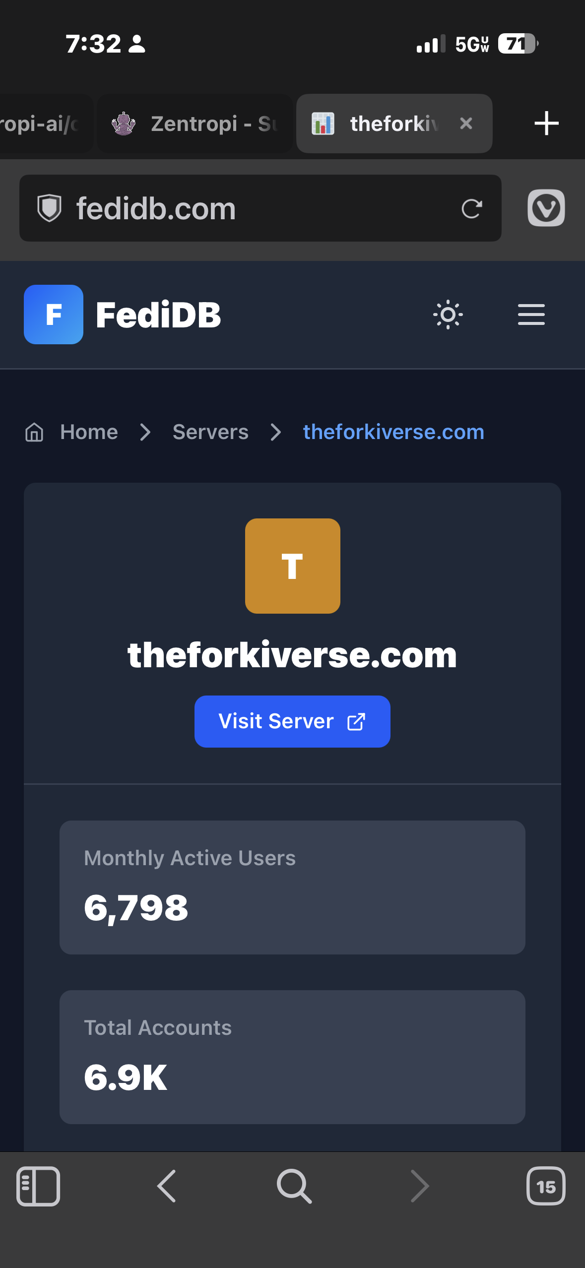 A screenshot of the website "theforkiverse.com" showing server statistics, including monthly active users and total accounts.
