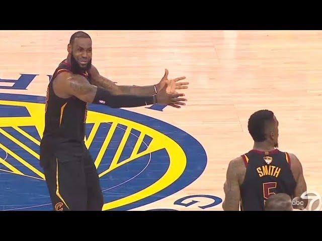LeBron James tries to point out an obvious read to JR Smith, who missed it and is still missing it. Poor LeBron looks apoplectic.