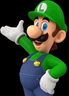 Image of the character Luigi from the Mario Brothers video game. He is standing with his left side quarter front to the viewer. His left hand is on his hip. His right arm is raised in gesture towards the background.