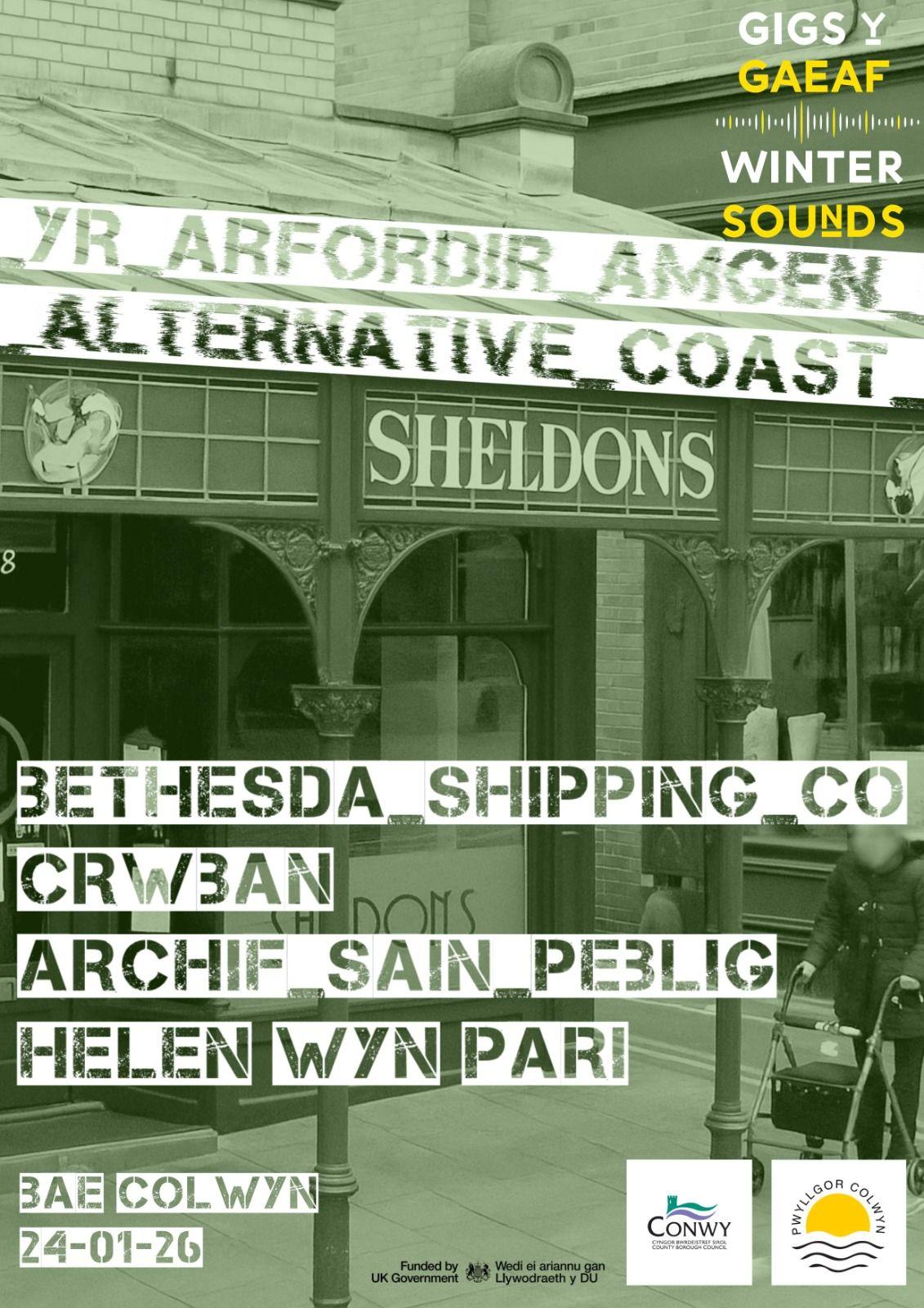 YR ARFORDIR AMGEN / ALTERNATIVE COAST GIGS Y GAEAF / WINTER SOUNDS Caffi SHELDON'S, BAE COLWYN 24-01-26 BETHESDA SHIPPING CO CRWBAN ARCHIF SAIN PBBLIG HELEN WYN PARI